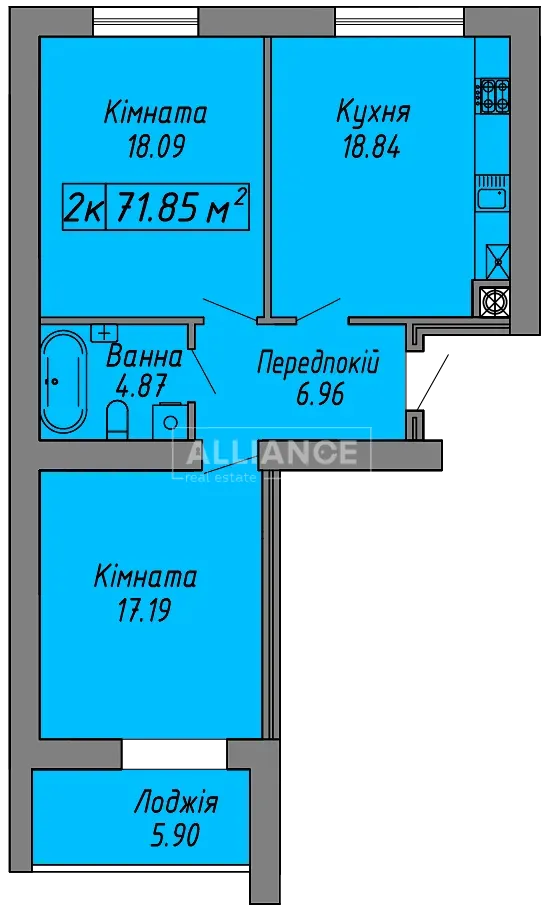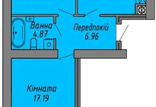 Квартира світла, двостороння, не кутова. Досить функціональне планування: кухня-студія та дві окремі кімнати.