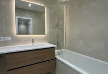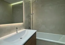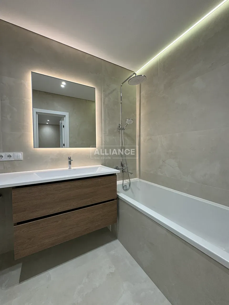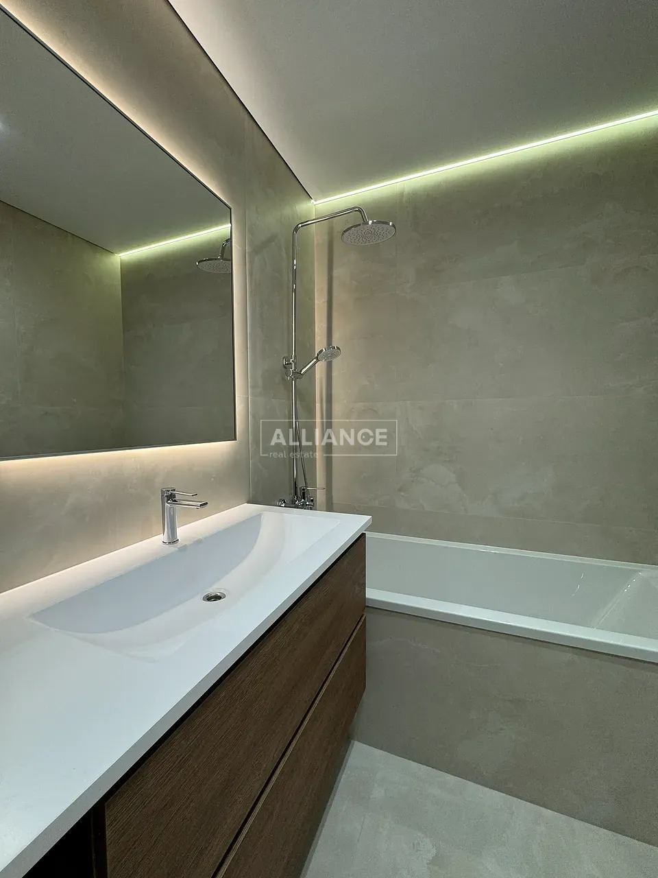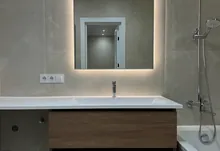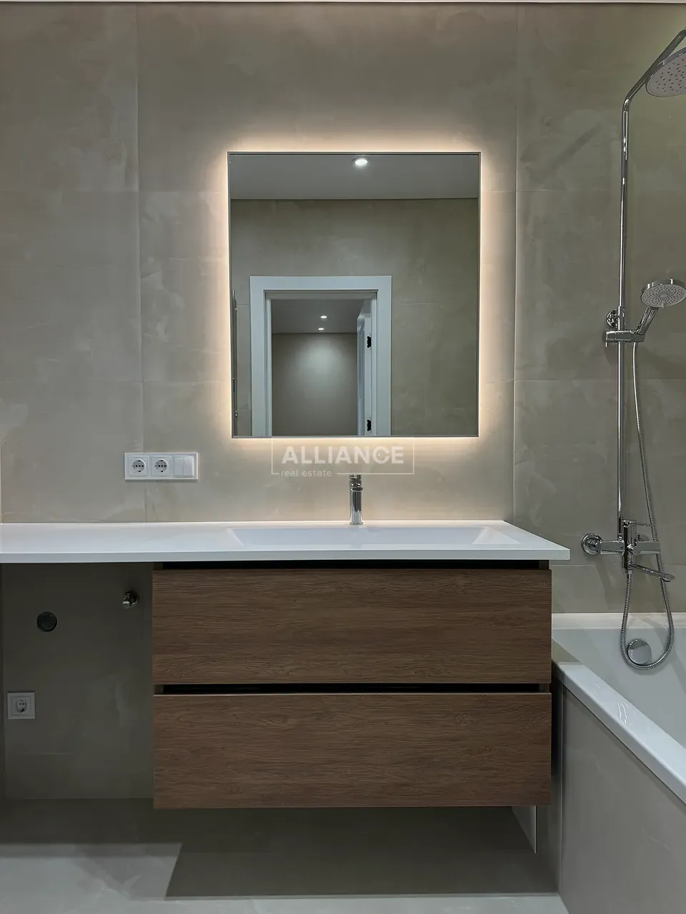 У ванній кімнаті встановлена інсталяція, зручний рукомийник, дзеркало з підсвіткою та ванна.