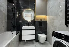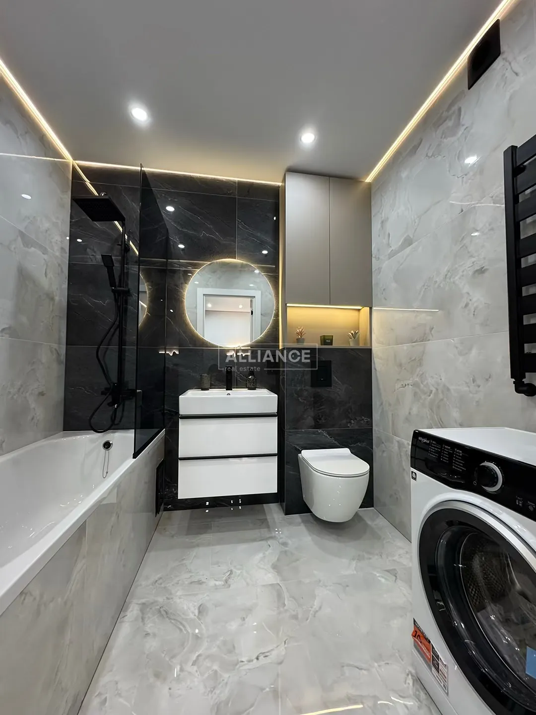 — Сучасна ванна кімната з душовою зоною, дзеркалом з підсвіткою та пральною машиною