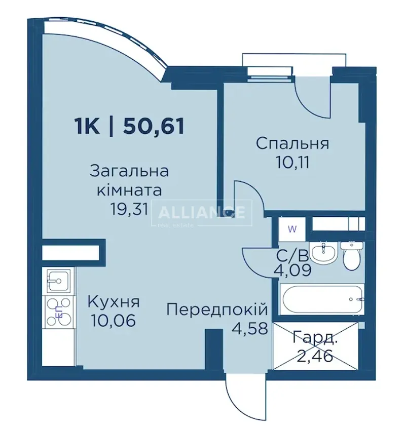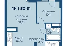 Продумане планування: простора кухня з можливістю зонування на кухню-студію та вітальню, окрема спальня, санвузол та місце під гардероб або кладову. Великі вікна забезпечують багато природного світла та відчуття простору.