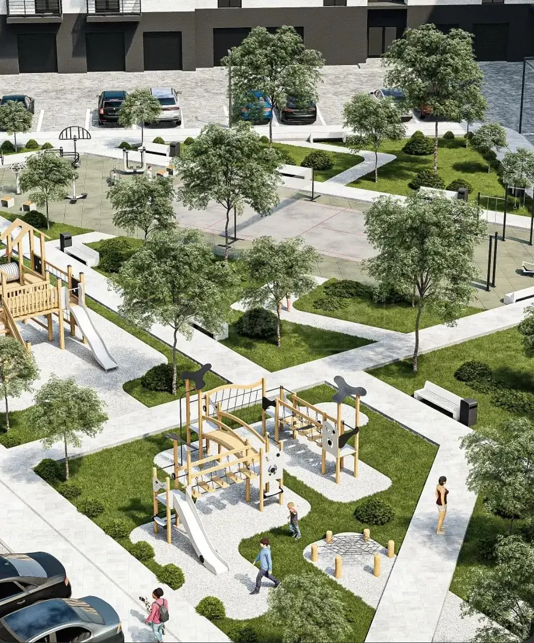 Територія має зелені зони, місця відпочинку, дитячий майданчик і парковку. Навколо є лише малоповерхові забудови та немає ключових доріг, тому тут завжди тихо та спокійно.