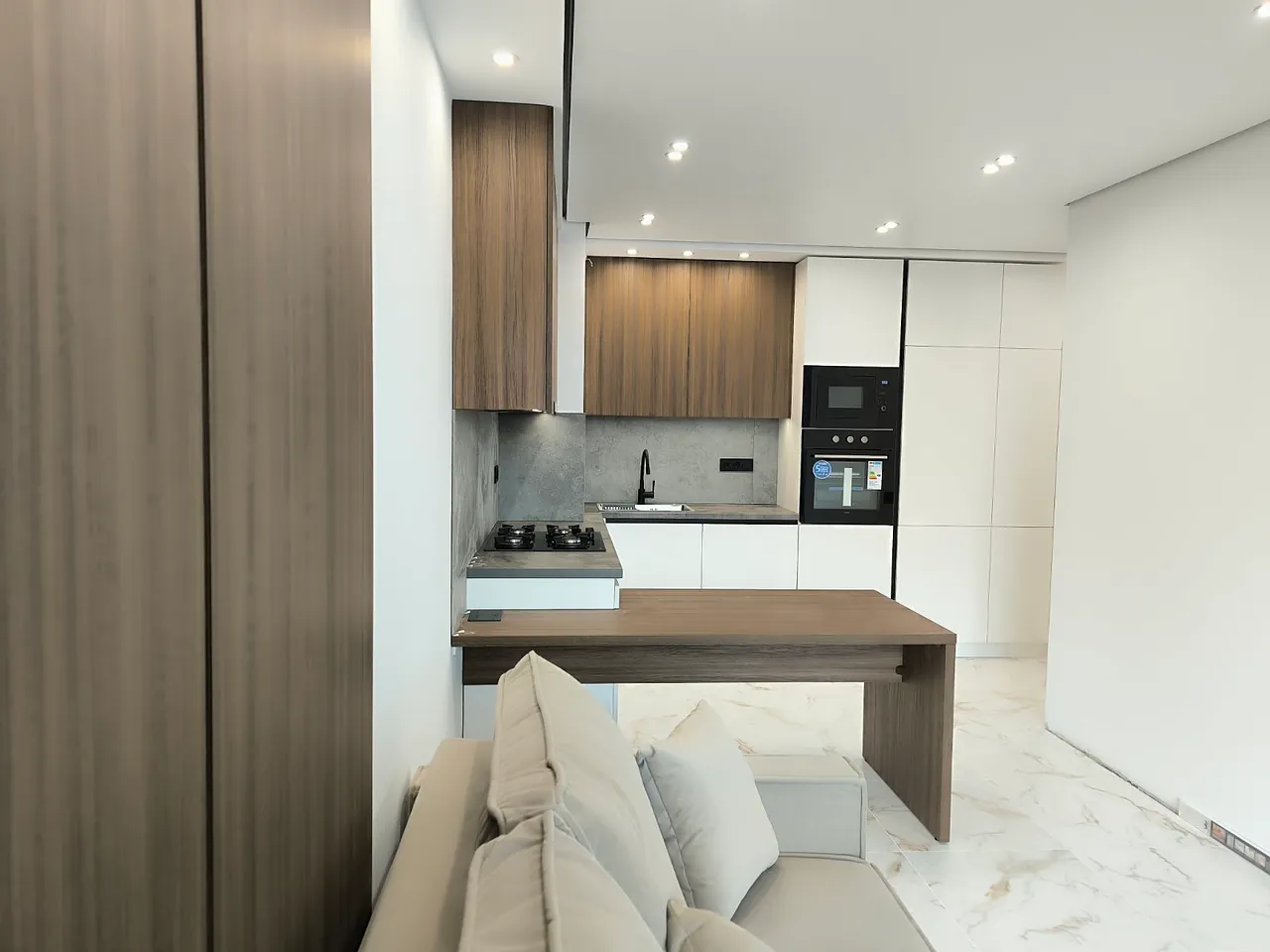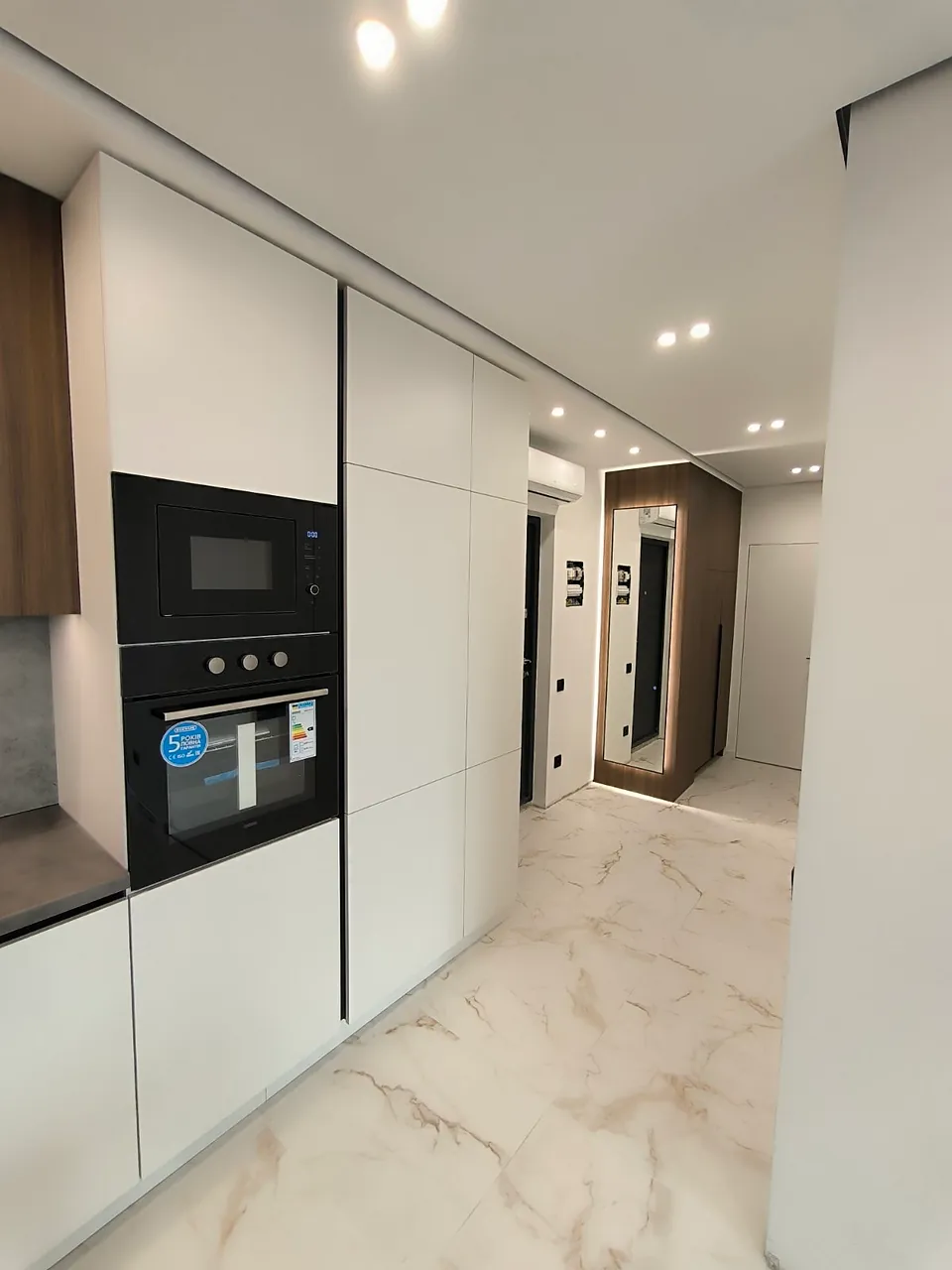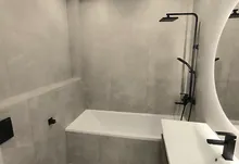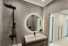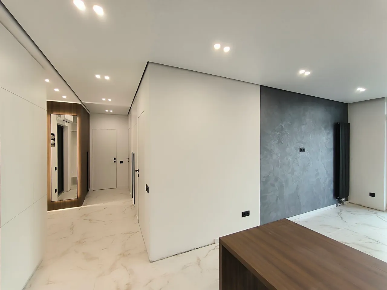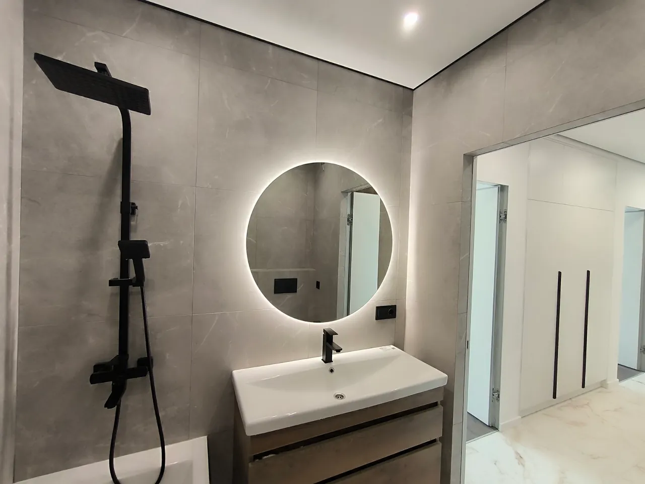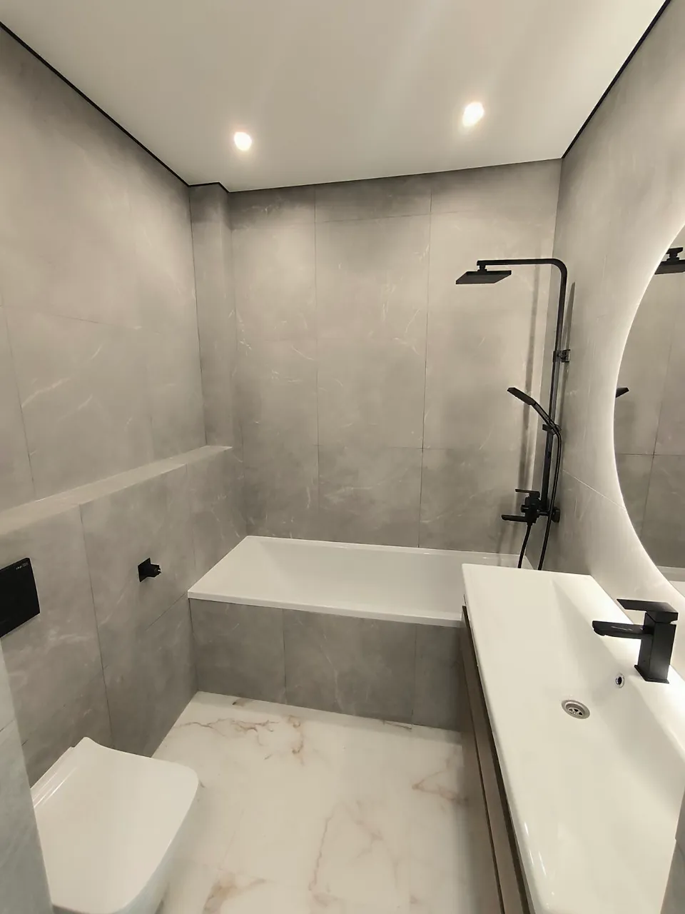 Декоративна штукатурка, широкоформатна плитка, підігрів підлоги, якісне освітлення.