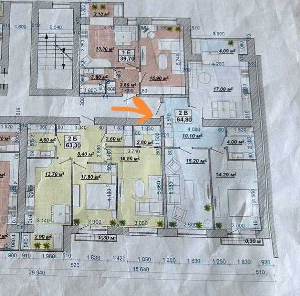 Квартира двостороння, розташована на видовому поверсі, загальна площа 64,8м.кв.