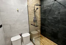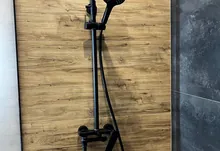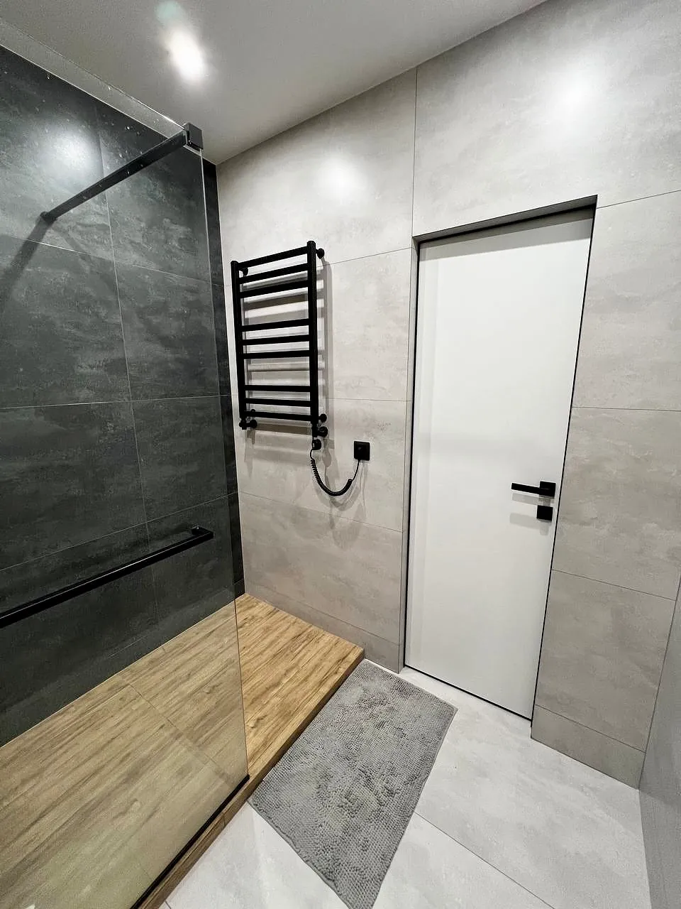 • Душова зона з чорними акцентами, надміцним склом і зручними тримачами для рушників.