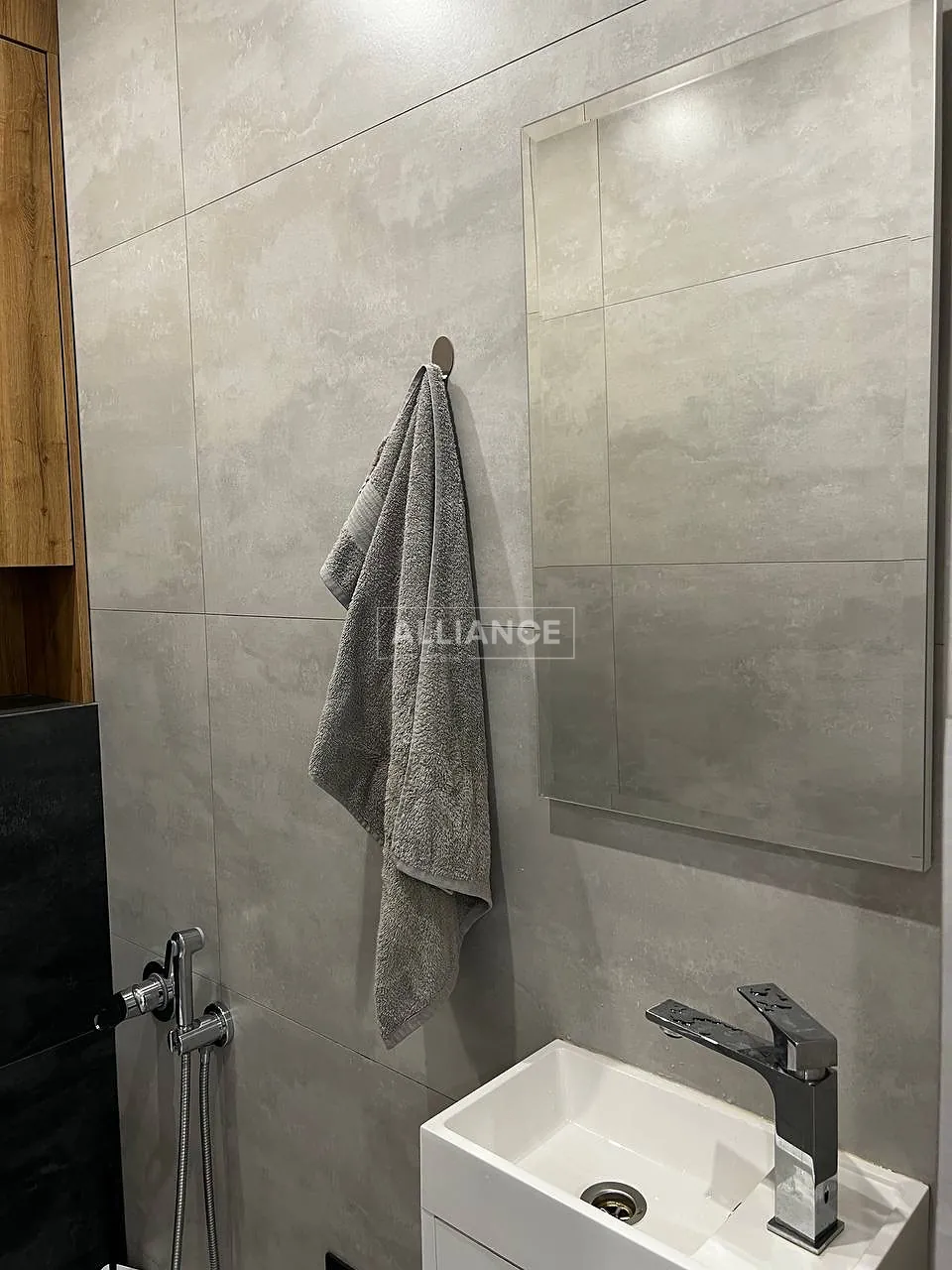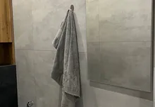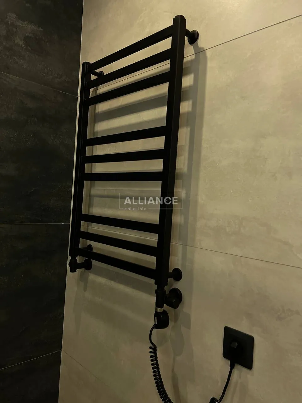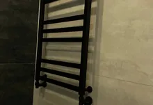 • У ванній кімнаті встановлена якісна чорна рушникосушка.