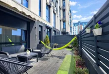 Всі вікна виходять на своє приватне огороджене подвірʼя з парканом висотою 180 см (є два виходи з вітальні та майстер спальні) на якому є вуличні меблі , маркіза та насаджені рослини.