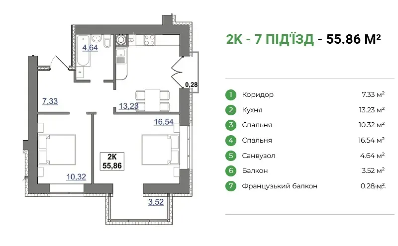 • Планування: кухня з французьким балконом, кімната з лоджією та ще одна кімната;