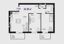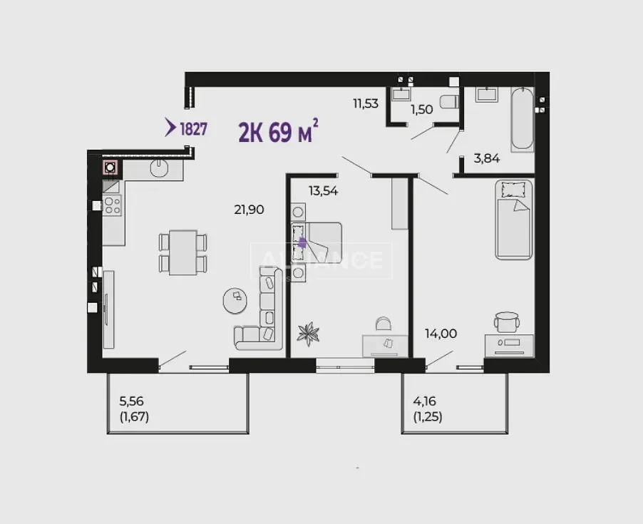 Зручне планування: кухня-студіо (21.9м²), перша спальня кімната (14м²), друга спальня (13.54 м²), санвузол (3.84м²) та туалет (1.5м²) та два відкриті балкони