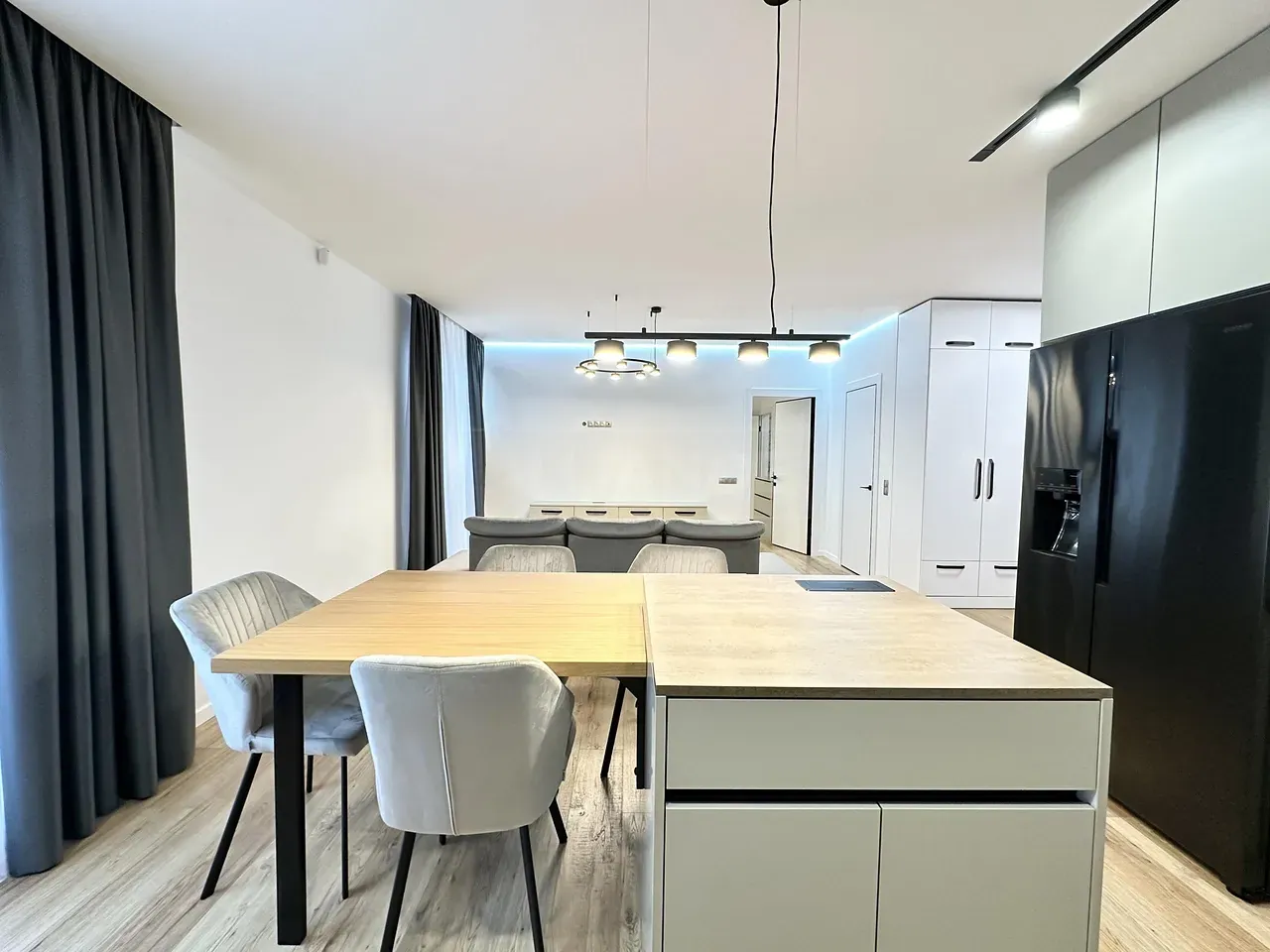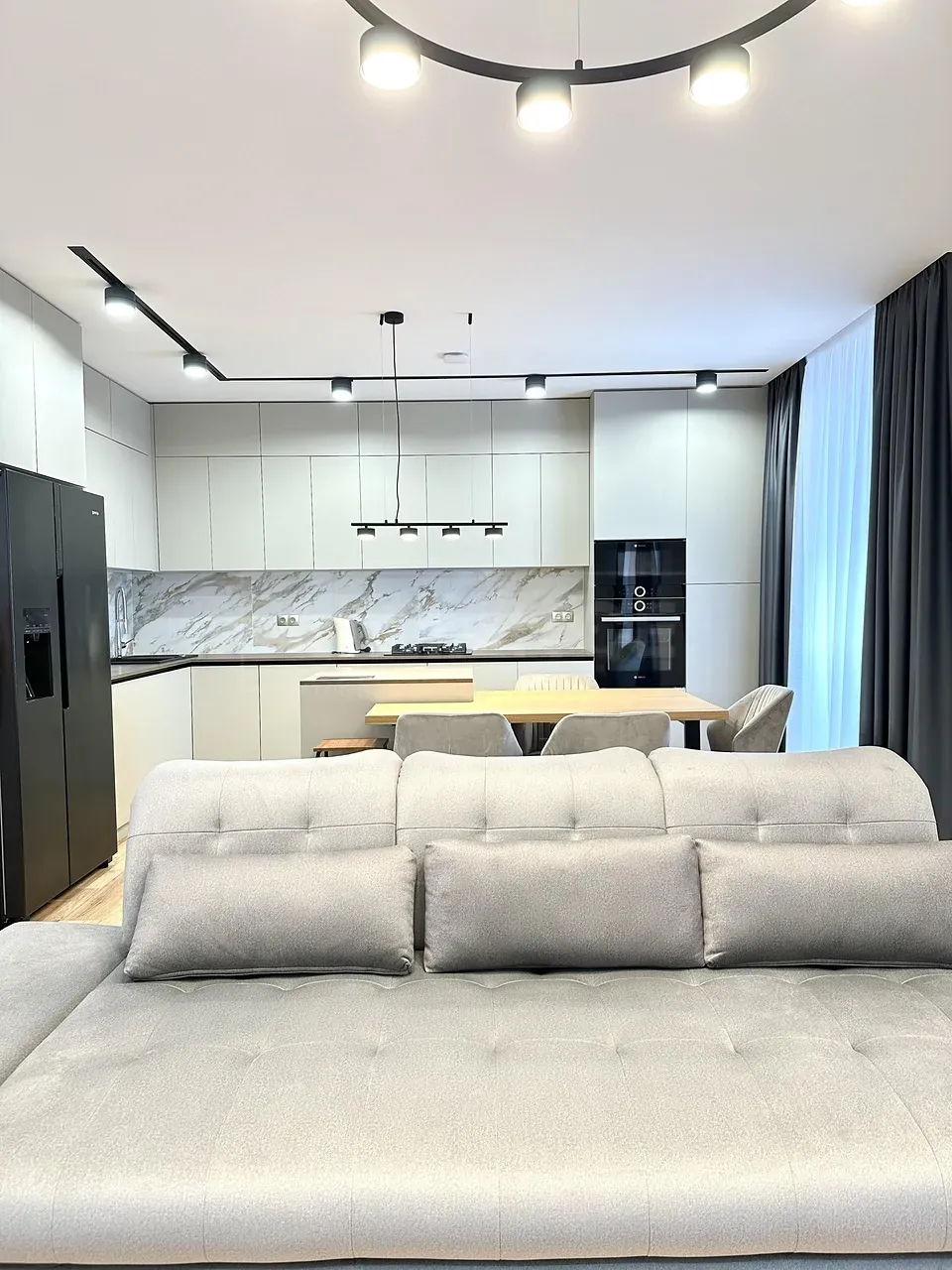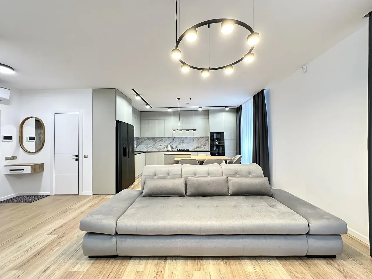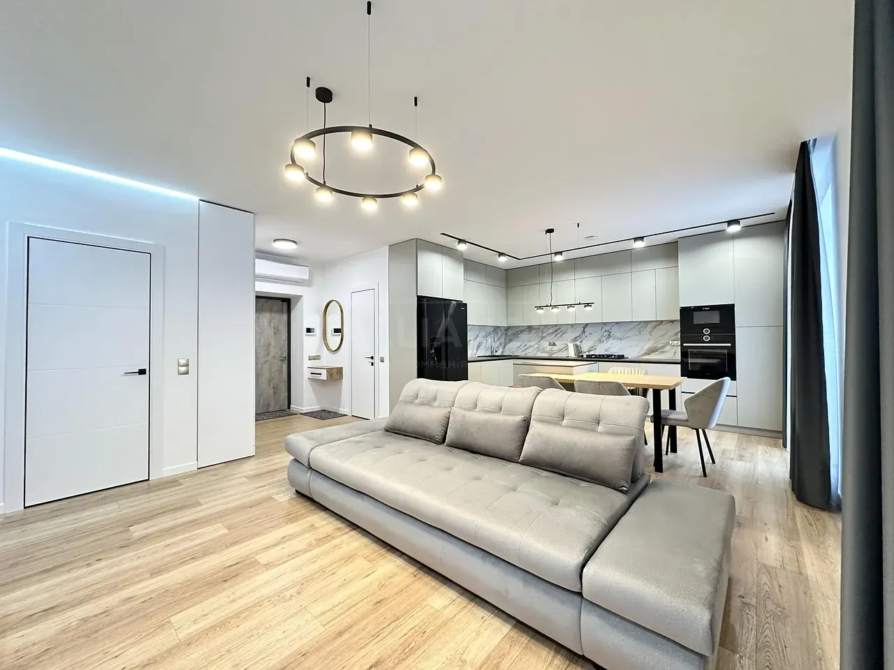 Вхідна група укомплектована вмонтованими шафами для зберігання одягу, гостьовий санвузол та велика гардеробна кімната, яку ви можете доукомплектувати індивідуально під свої потреби. Далі ви потрапляєте у велику кухню-студію, яка має робочу зону та стильний острів зі столом, а також відпочинкову зону з великим розкладним диваном та місцем під телевізор. Також є відділена велика зона, яка може використовуватися як робочий кабінет з великими панорамними вікнами. Наступна кімната це простора батьківська спальна з власним санвузлом, шо дає додатковий комфорт для вашого проживання.