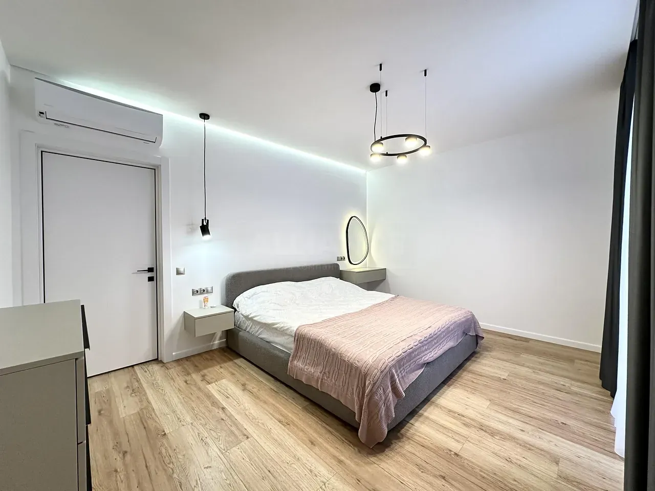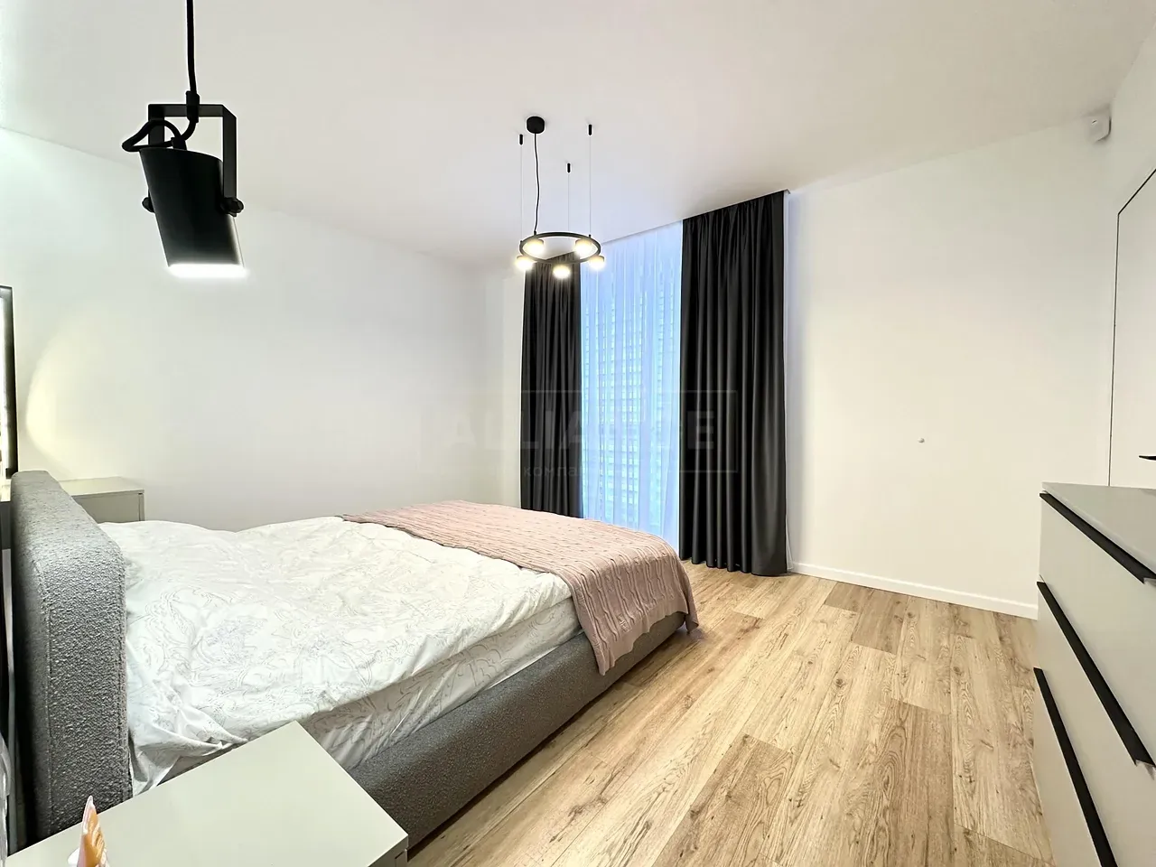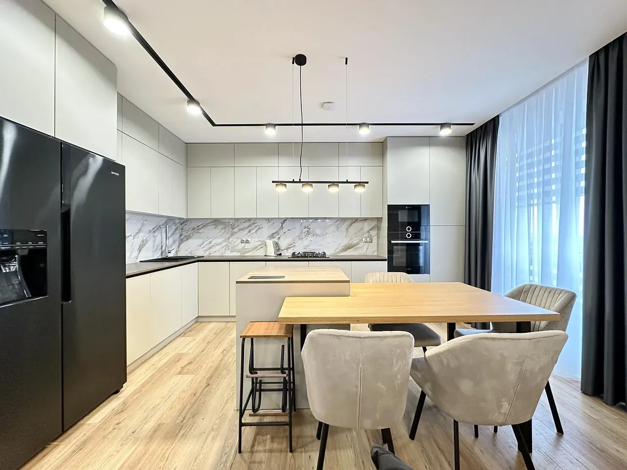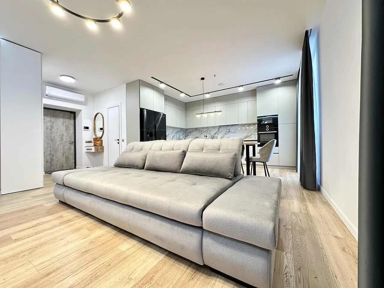 Вхідна група укомплектована вмонтованими шафами для зберігання одягу, гостьовий санвузол та велика гардеробна кімната, яку ви можете доукомплектувати індивідуально під свої потреби. Далі ви потрапляєте у велику кухню-студію, яка має робочу зону та стильний острів зі столом, а також відпочинкову зону з великим розкладним диваном та місцем під телевізор. Також є відділена велика зона, яка може використовуватися як робочий кабінет з великими панорамними вікнами. Наступна кімната це простора батьківська спальна з власним санвузлом, шо дає додатковий комфорт для вашого проживання.
