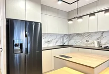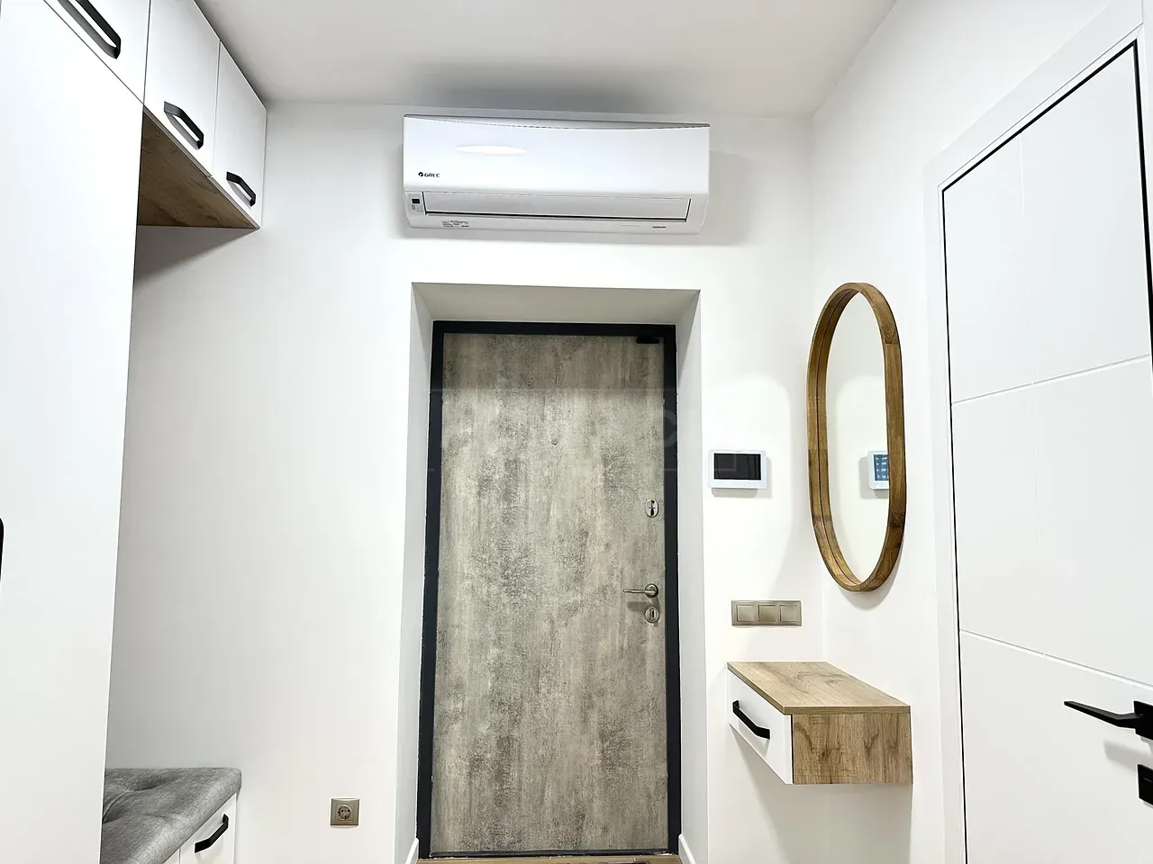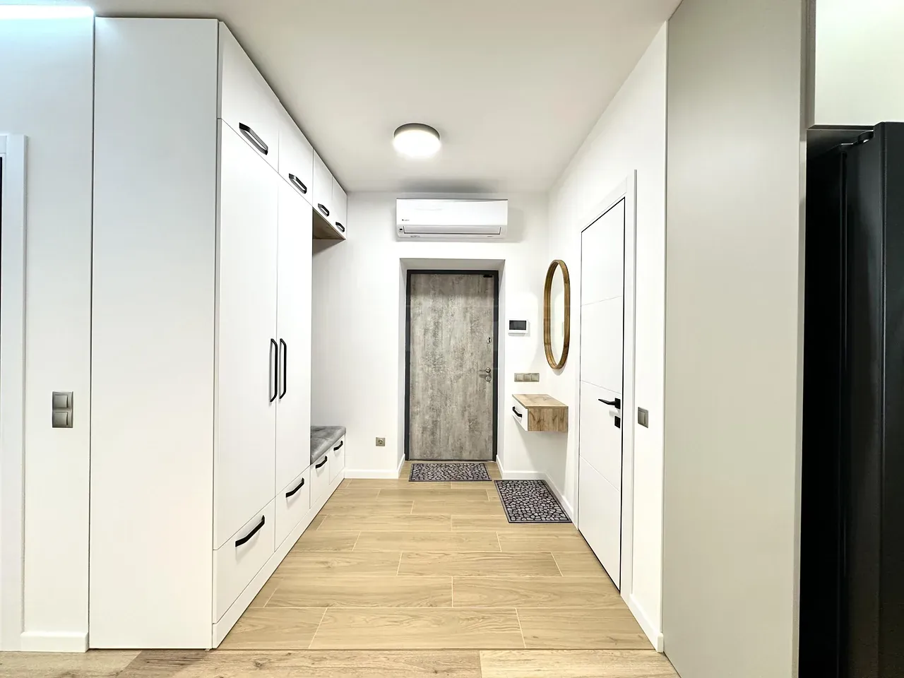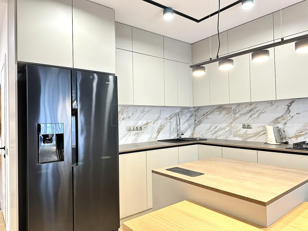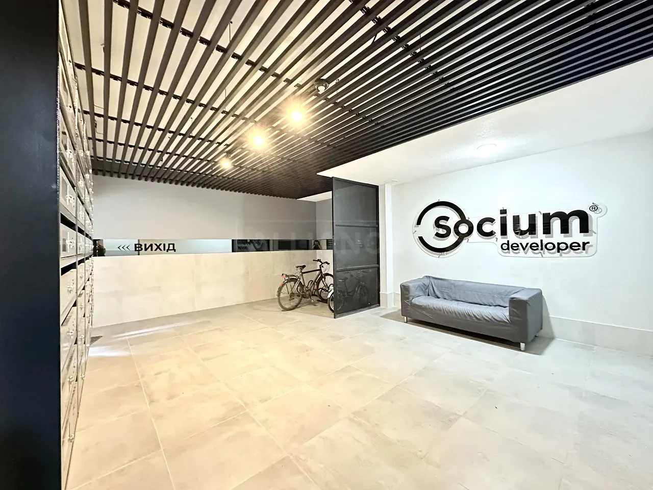 Вхідна група укомплектована вмонтованими шафами для зберігання одягу, гостьовий санвузол та велика гардеробна кімната, яку ви можете доукомплектувати індивідуально під свої потреби. Далі ви потрапляєте у велику кухню-студію, яка має робочу зону та стильний острів зі столом, а також відпочинкову зону з великим розкладним диваном та місцем під телевізор. Також є відділена велика зона, яка може використовуватися як робочий кабінет з великими панорамними вікнами. Наступна кімната це простора батьківська спальна з власним санвузлом, шо дає додатковий комфорт для вашого проживання.
