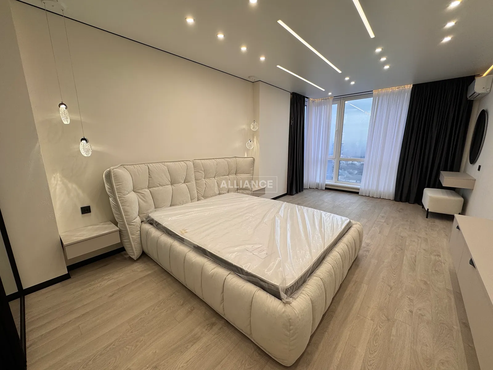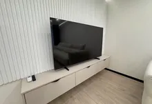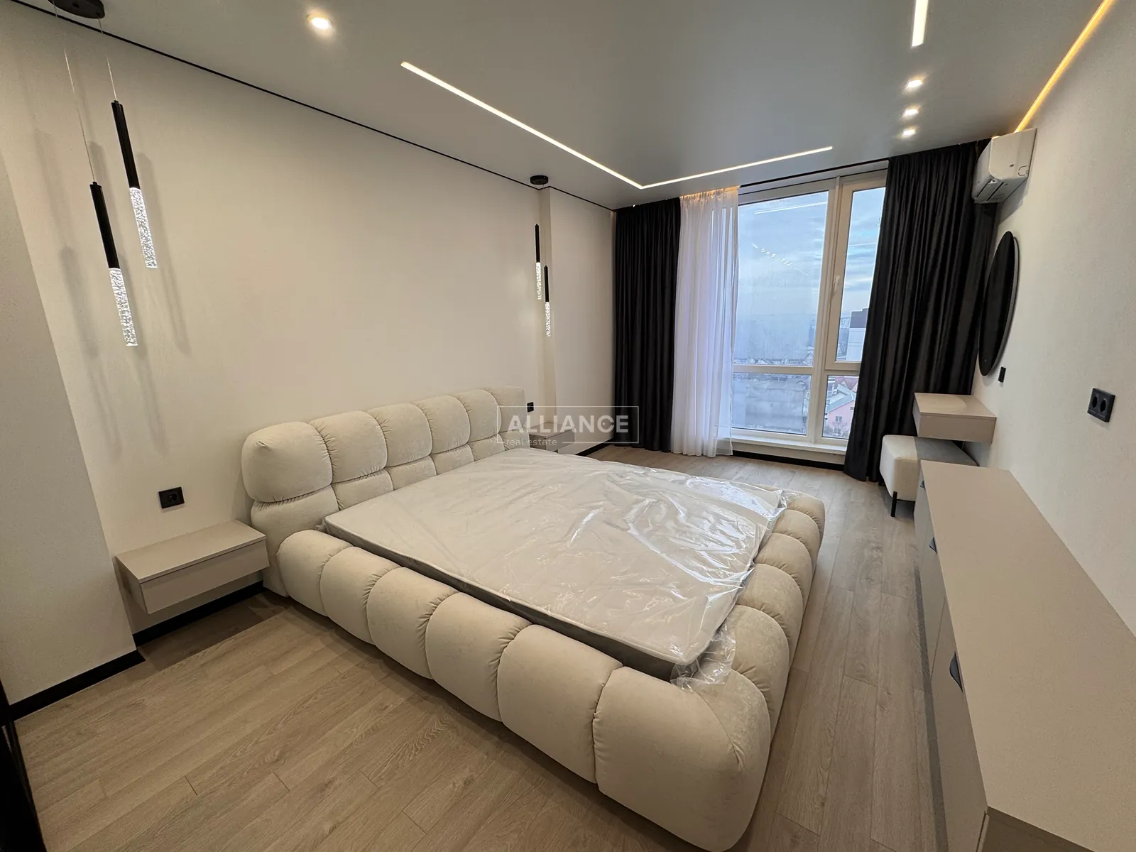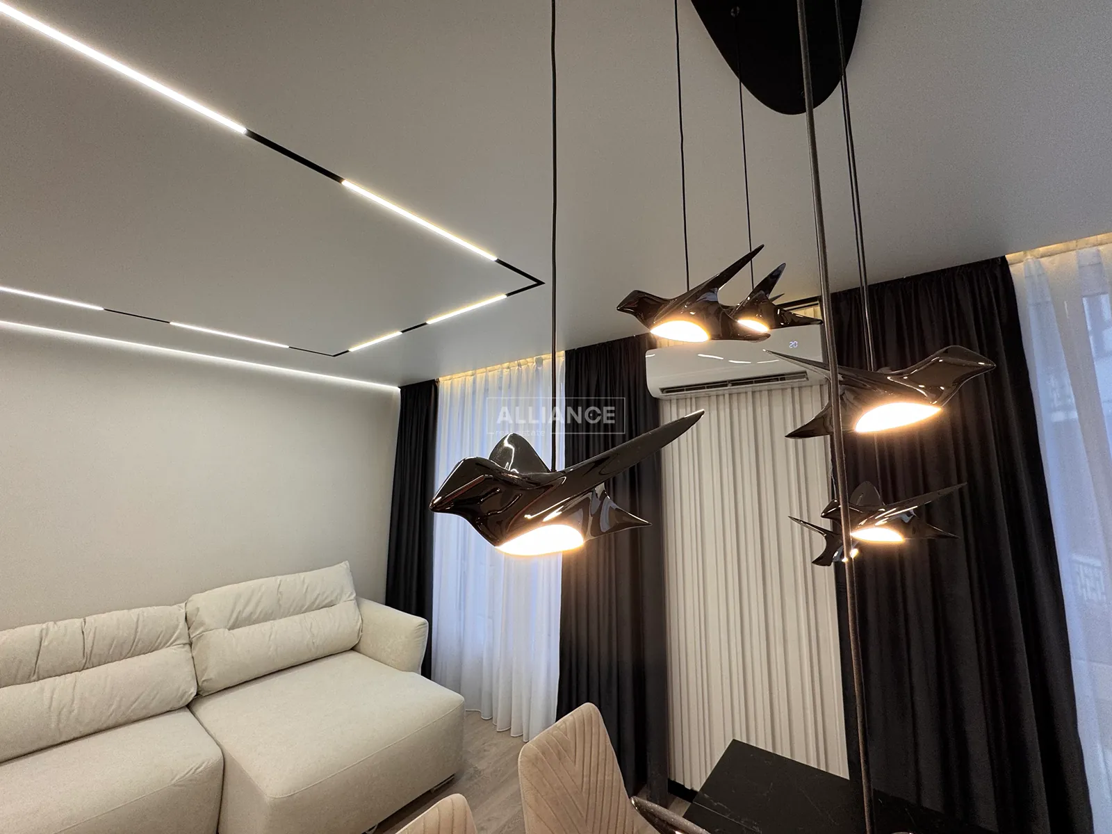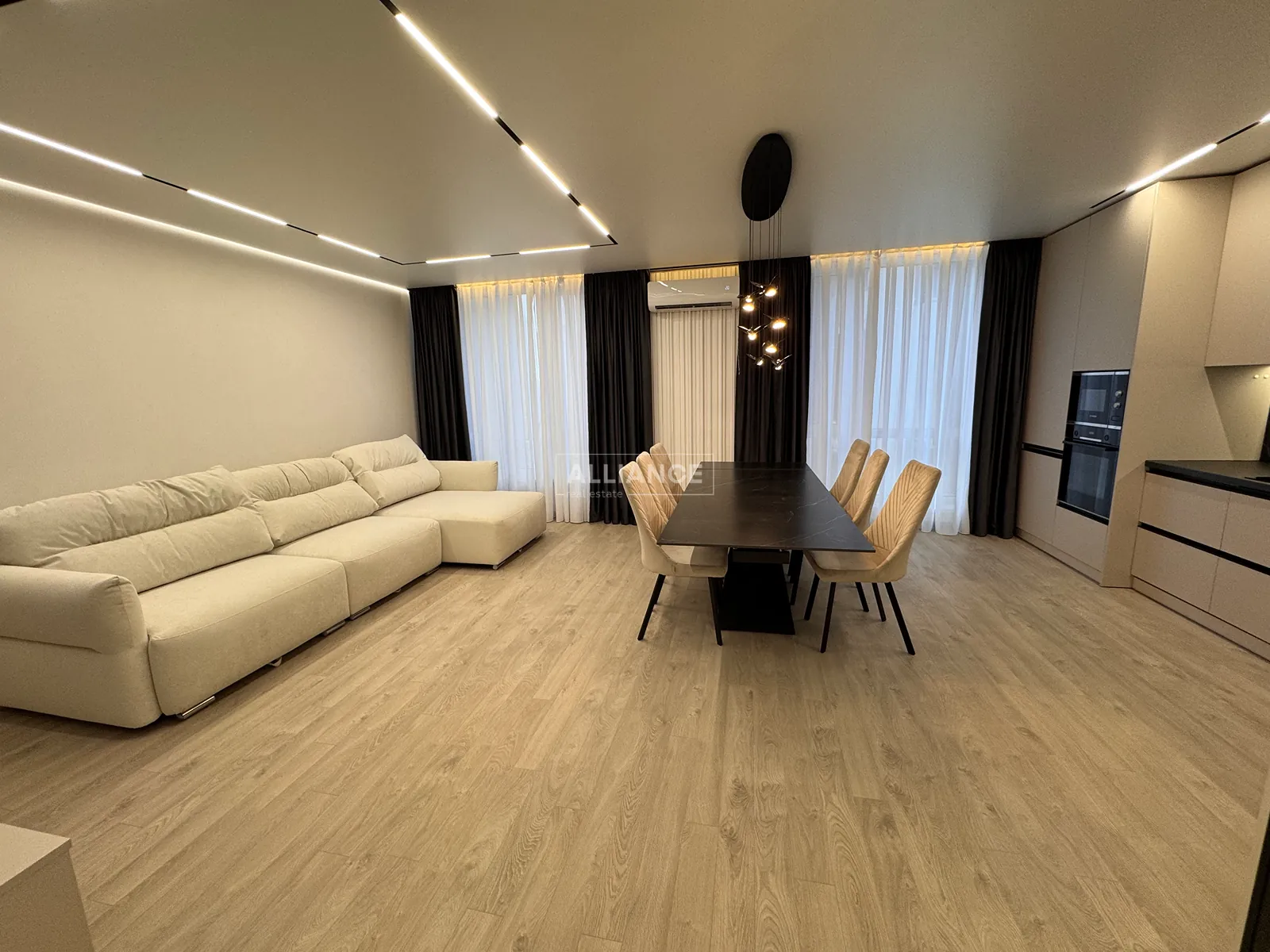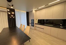 Інтерʼєр виконаний у сучасному мінімалістичному стилі — поєднання світлих фасадів, чорних акцентів та теплої підсвітки створює атмосферу затишку та статусу.