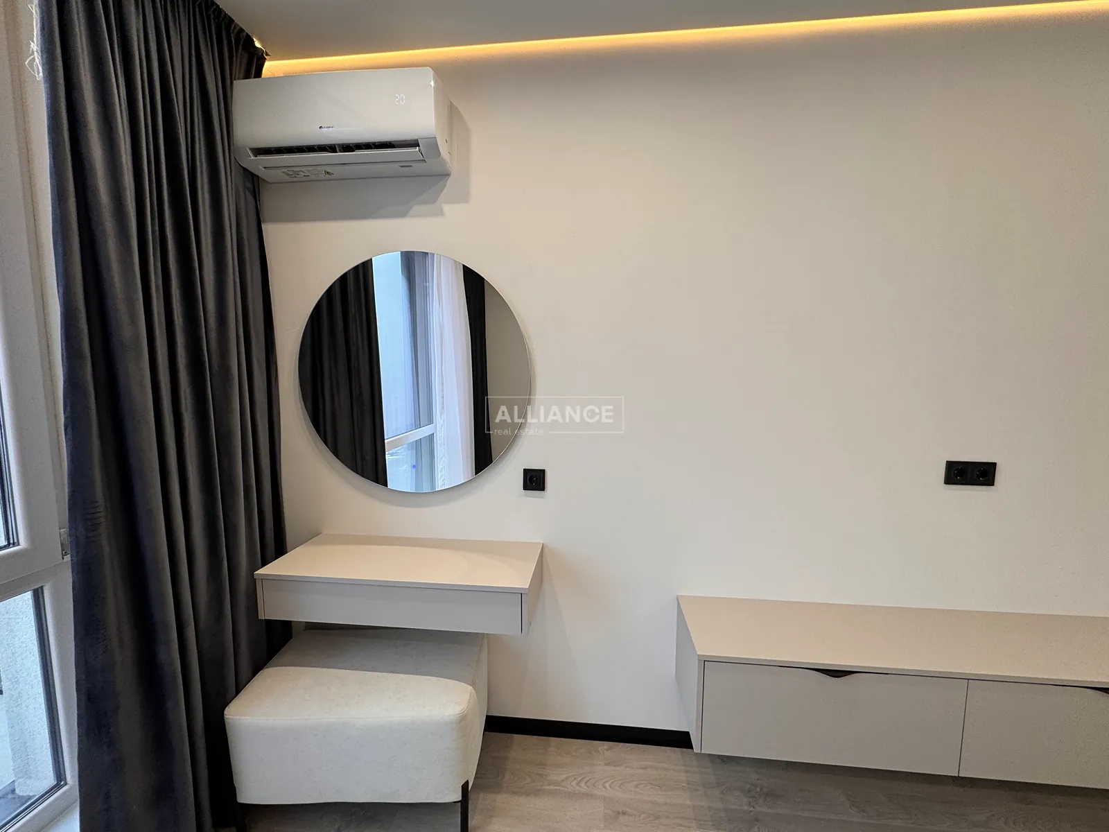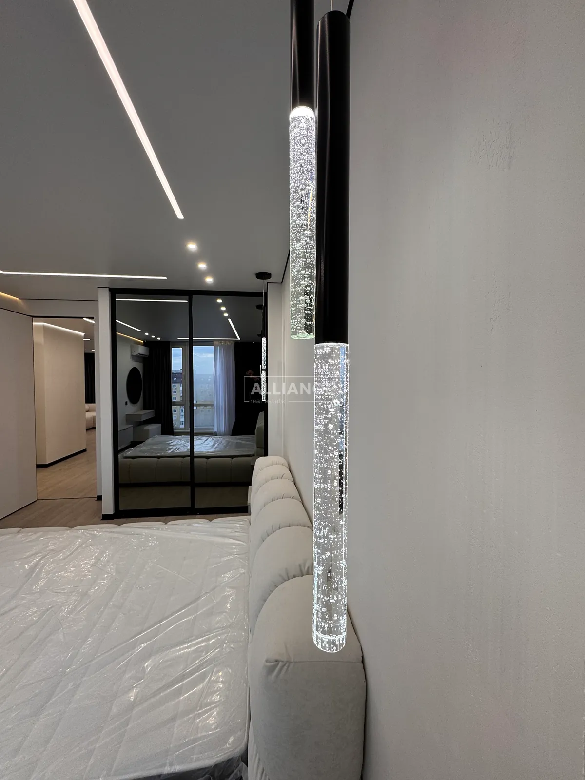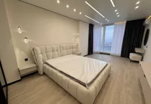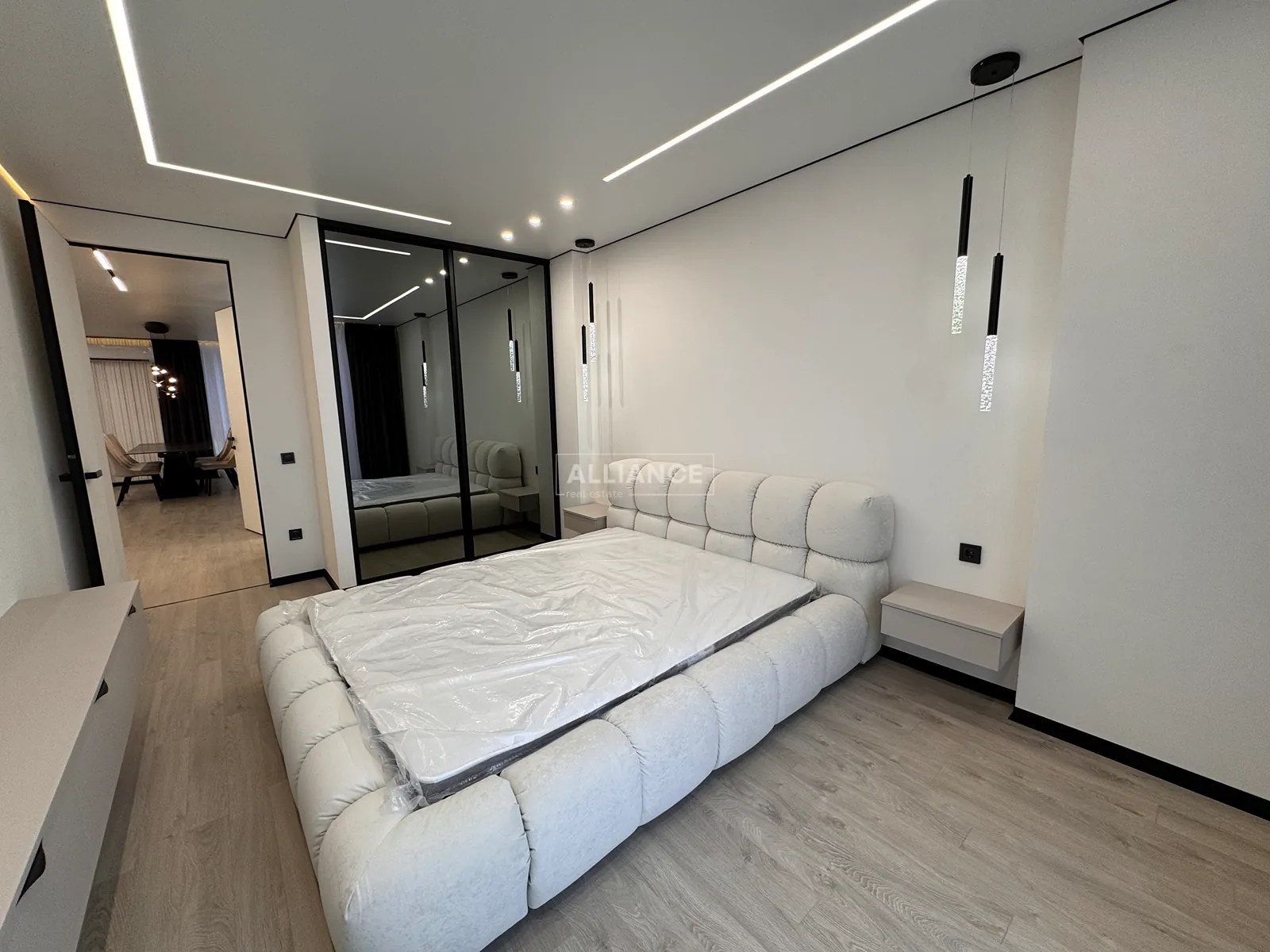 Інтерʼєр виконаний у сучасному мінімалістичному стилі — поєднання світлих фасадів, чорних акцентів та теплої підсвітки створює атмосферу затишку та статусу.
