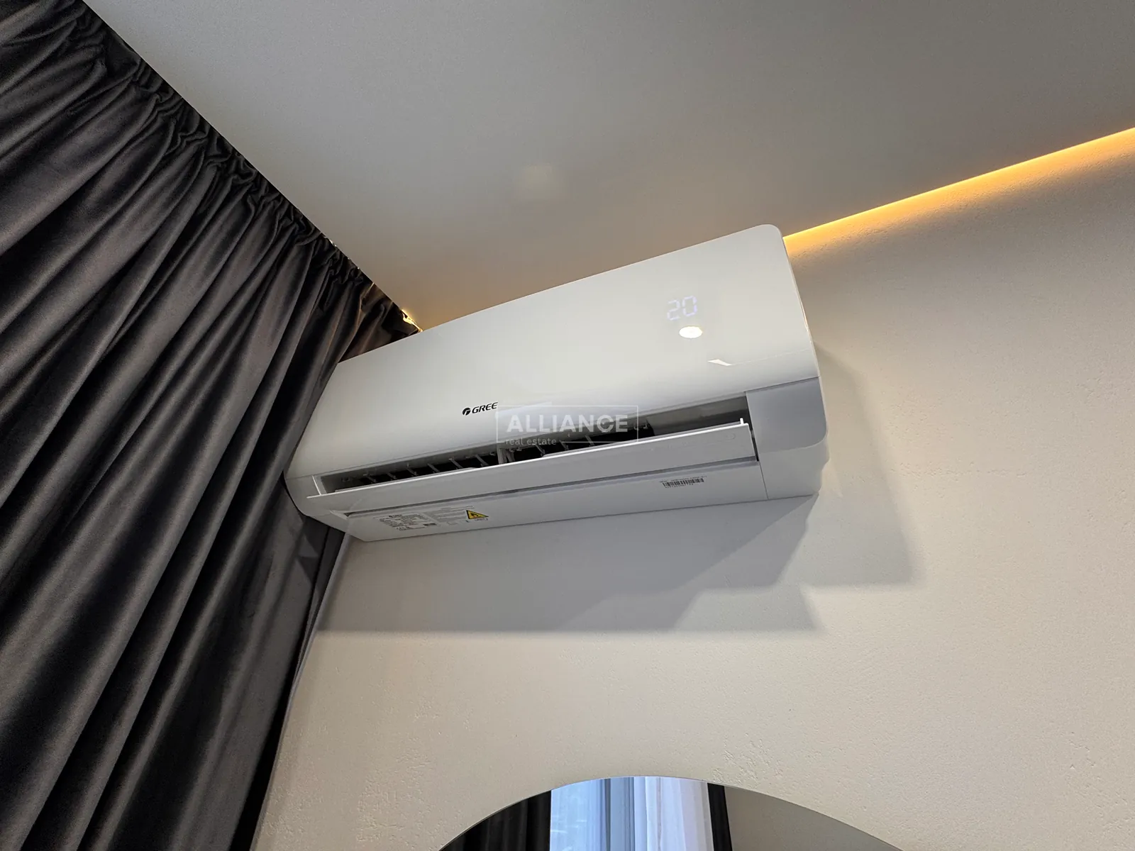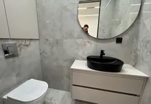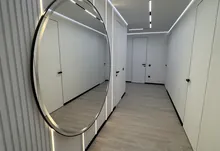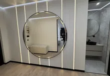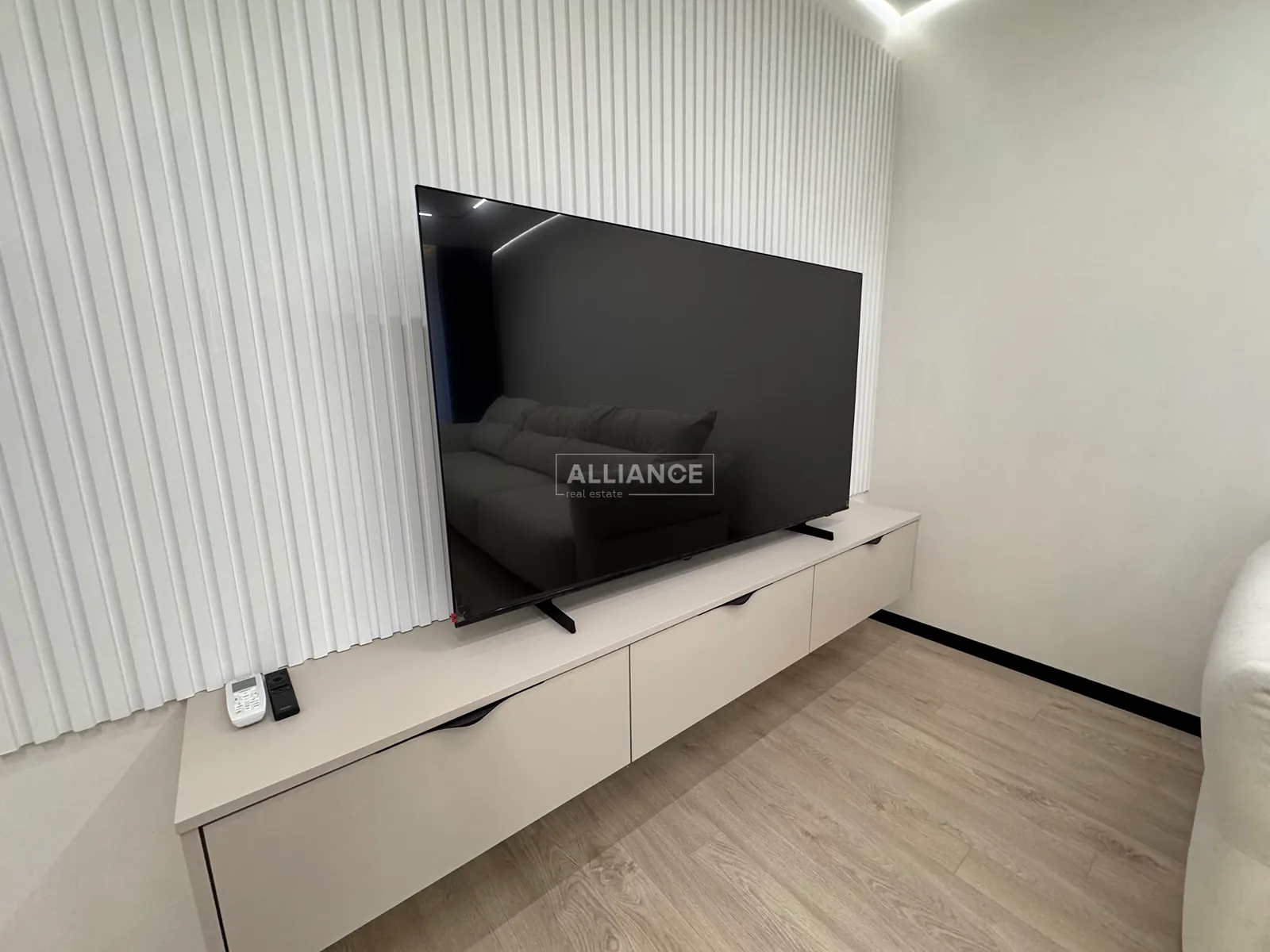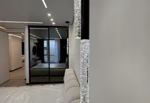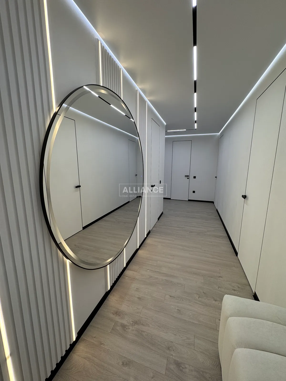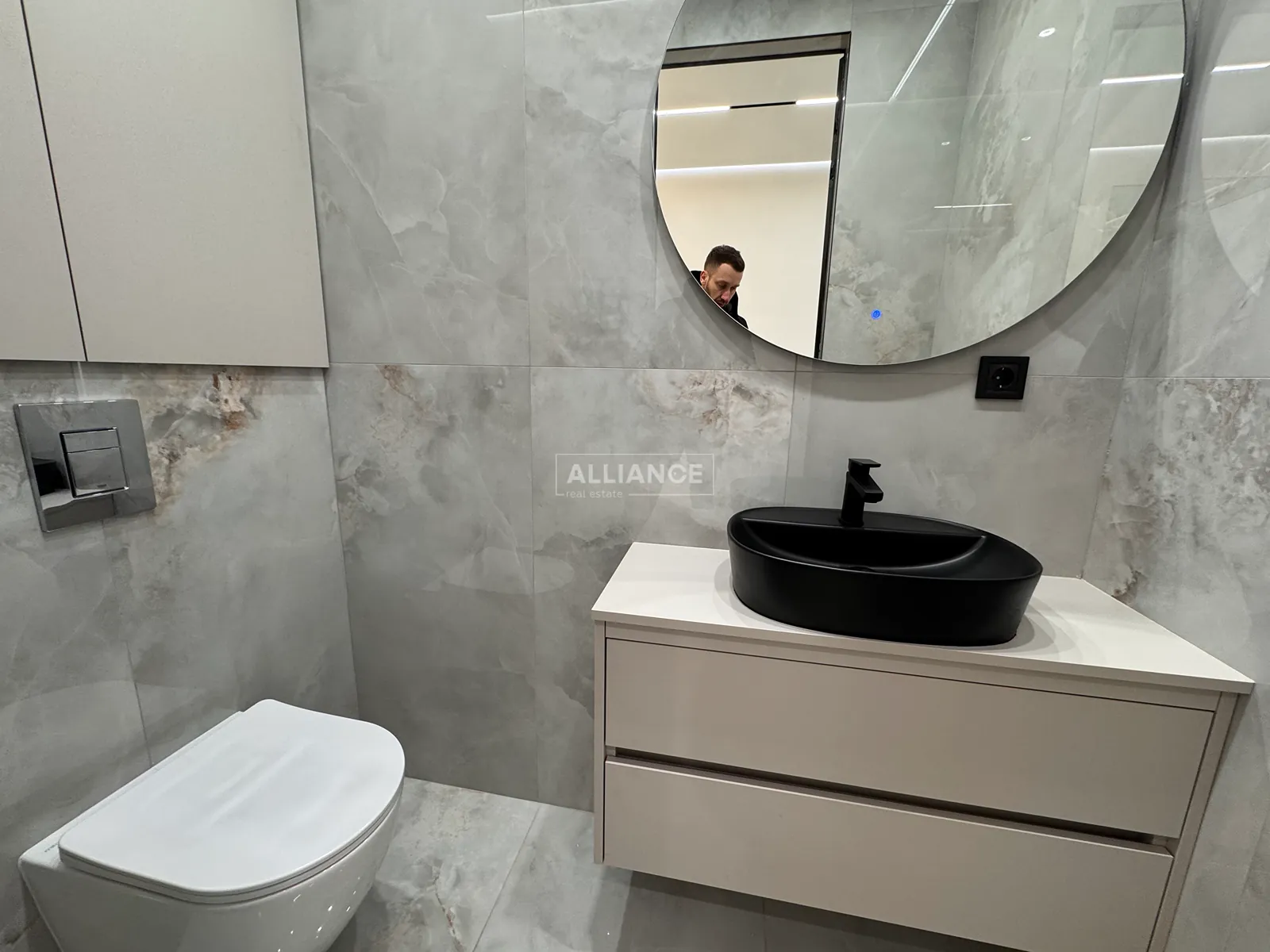 Інтерʼєр виконаний у сучасному мінімалістичному стилі — поєднання світлих фасадів, чорних акцентів та теплої підсвітки створює атмосферу затишку та статусу.