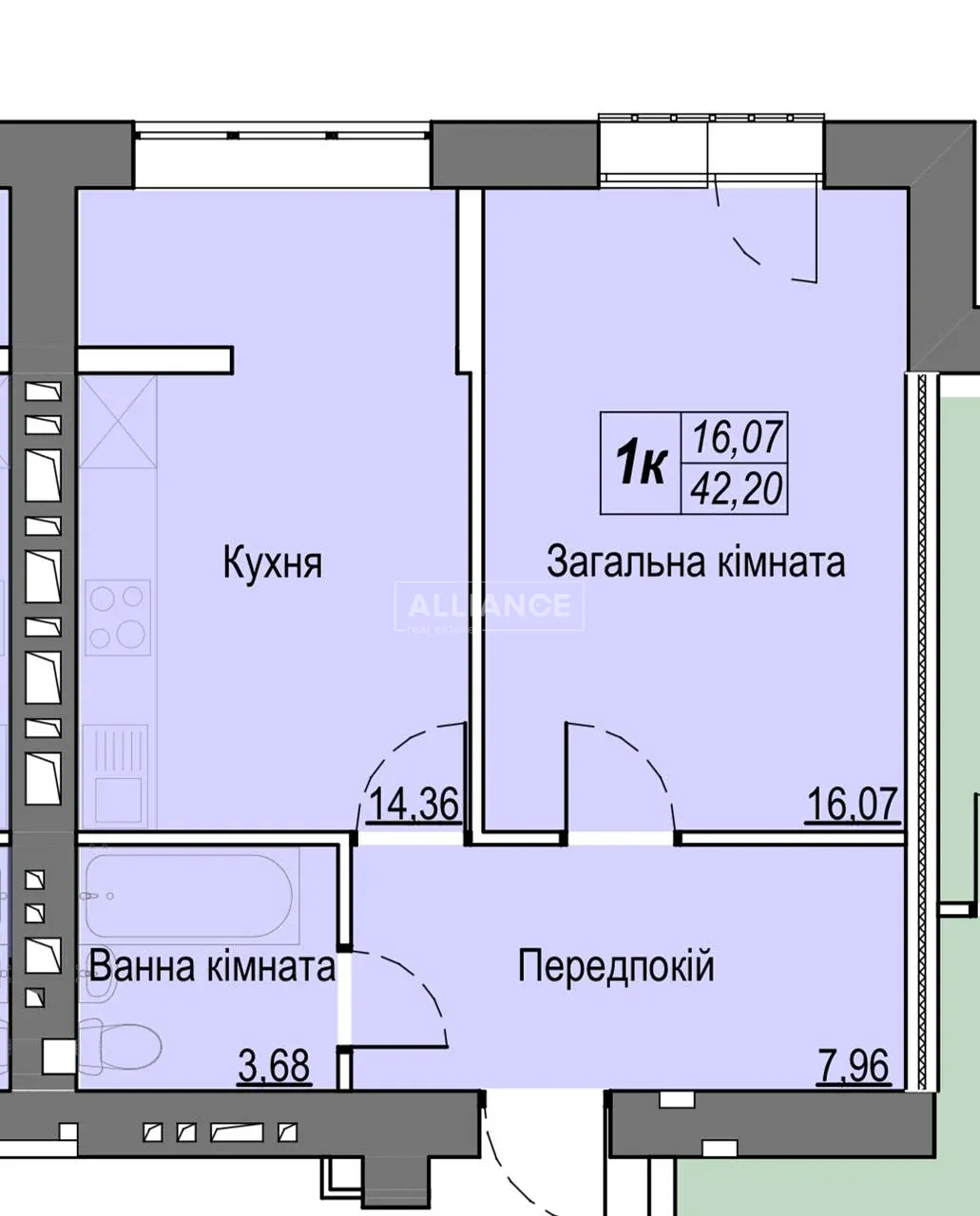 Раціональне планування забезпечує зручність і комфорт: простора кімната, кухня з виходом на балкон, окрема зона передпокою та санвузол. Великі вікна забезпечують чудове природне освітлення.