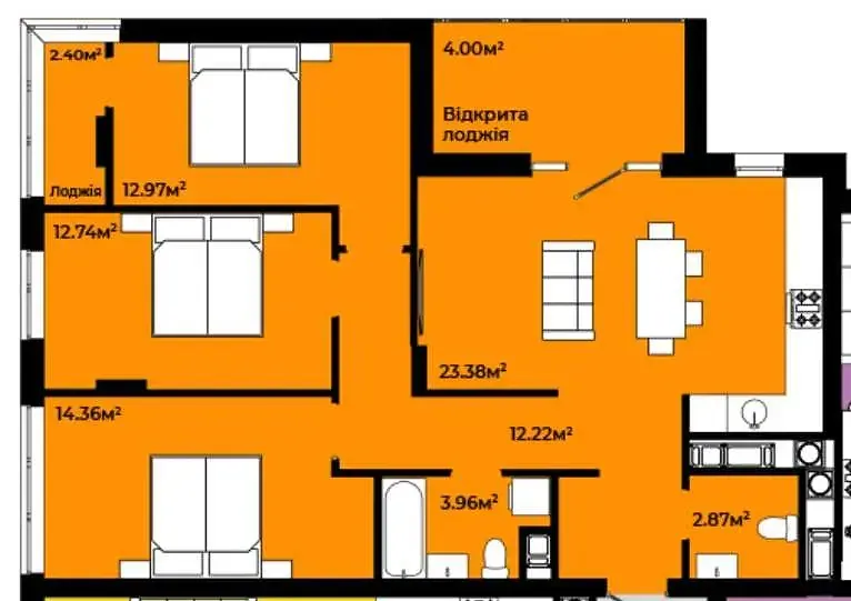 Три окремі кімнати + простора кухня-студія площею 24 м²