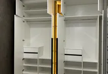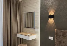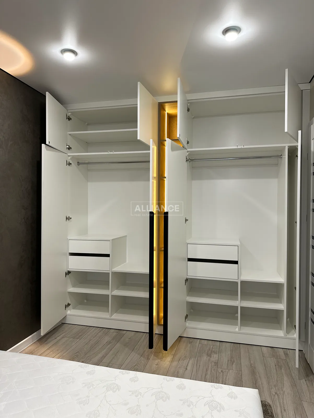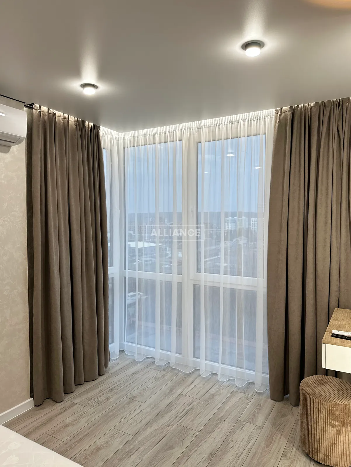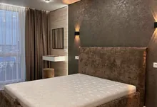 Квартира має продумане планування : простора кімната з великим спальним ліжком, місткою шафою та робочою зоною, окрема сучасна кухня з вбудованими меблями та технікою, а також акуратна ванна кімната з сантехнікою преміум - класу.