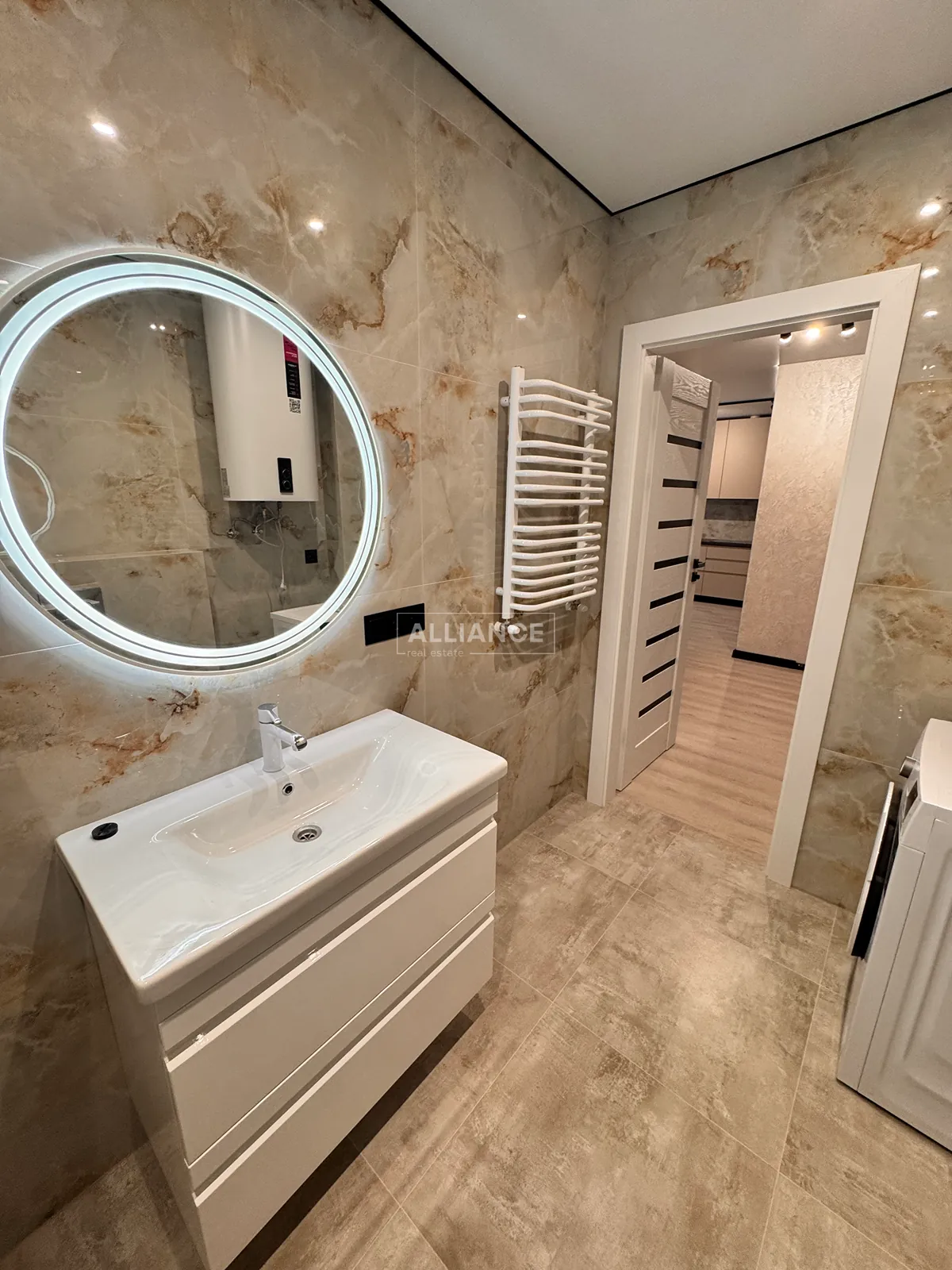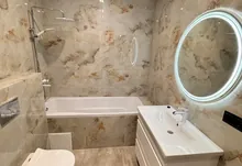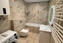 Суміжний санвузол виконаний з широкоформатної плитки у світлих тонах!