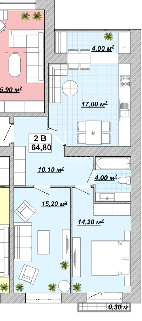 Квартира двостороння, розташована на видовому поверсі, загальна площа 64.8 м.кв.