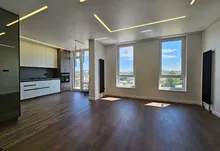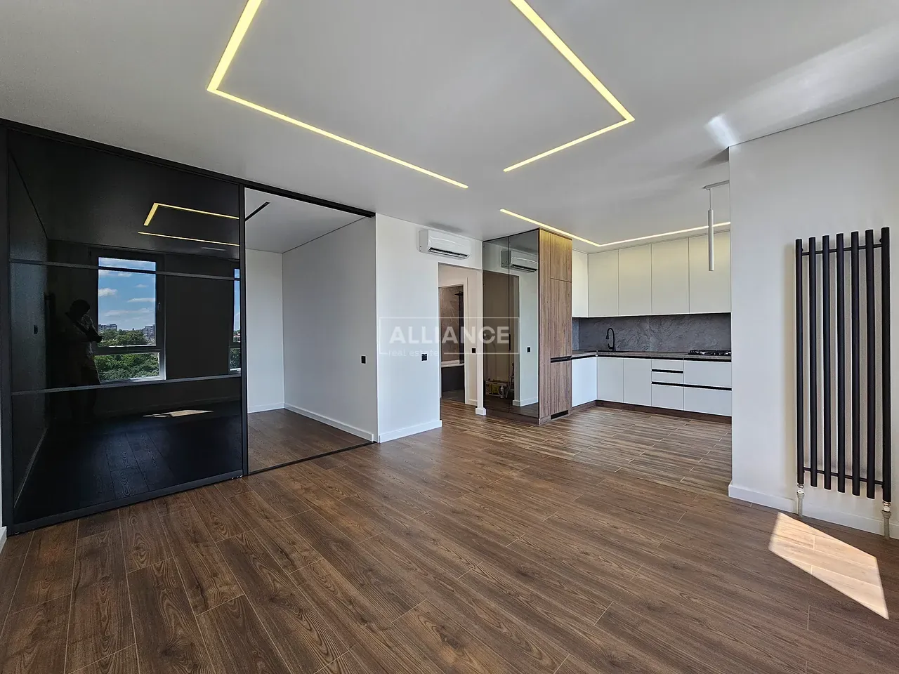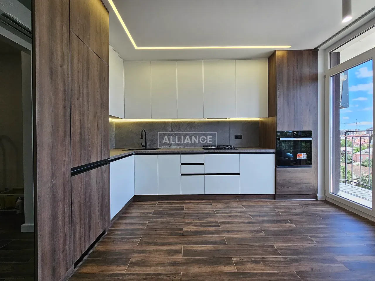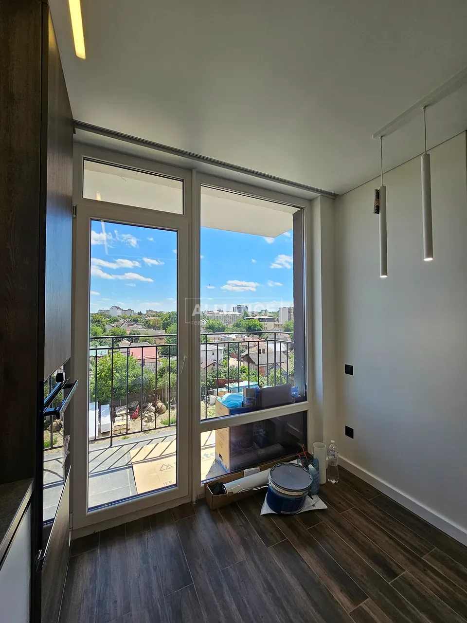 Квартира перепланована: окрема спальня, зона вітальні та кухня з просторим відкритим балконом.