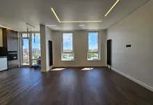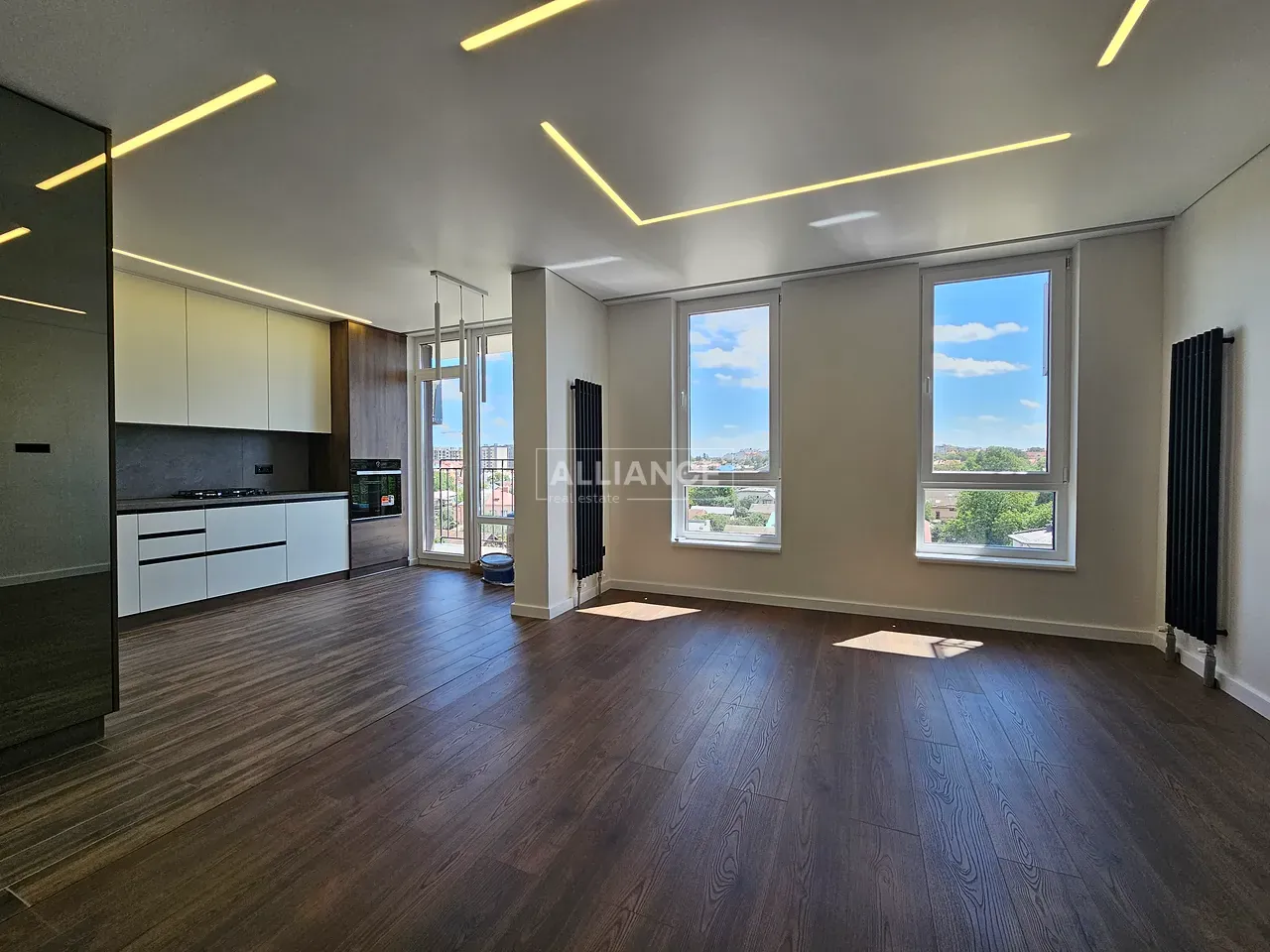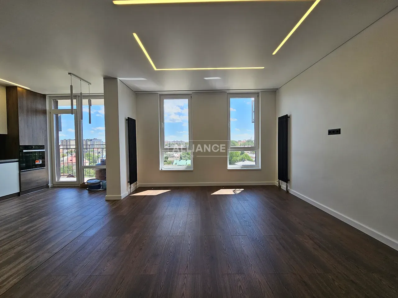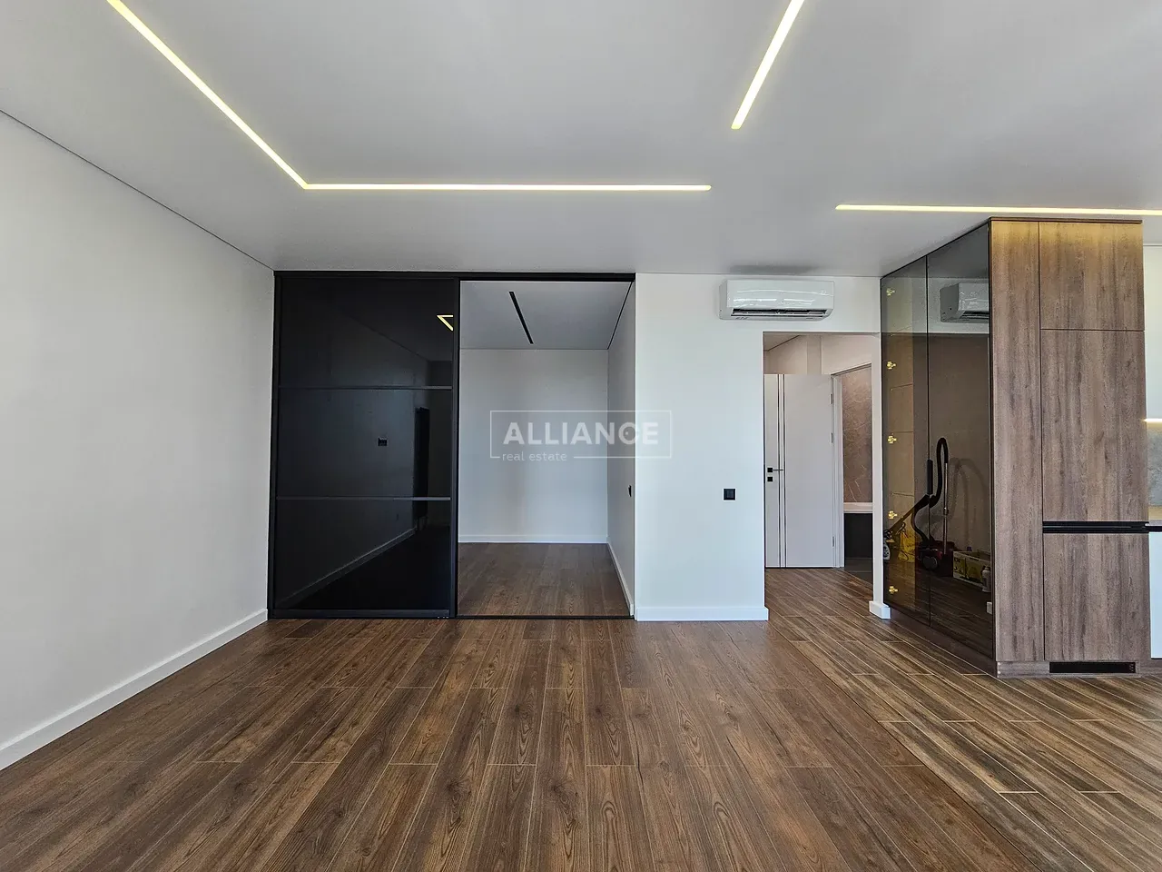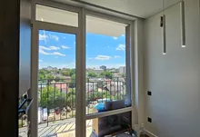 Квартира перепланована: окрема спальня, зона вітальні та кухня з просторим відкритим балконом.