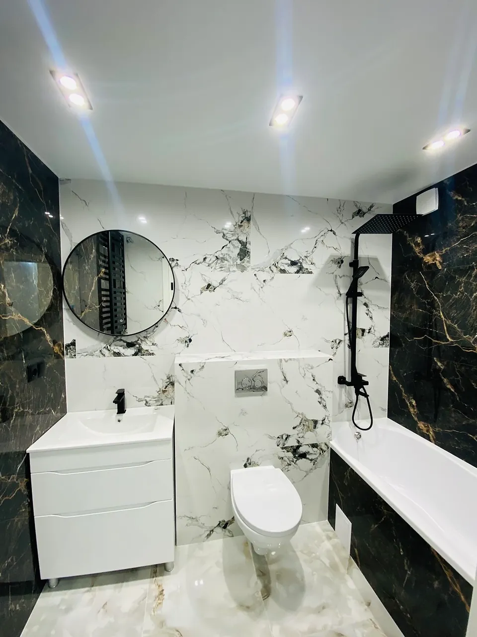 У санвузлі туалет інсталяція, ванна , пральна машинка, дзеркало з підсвіткою.