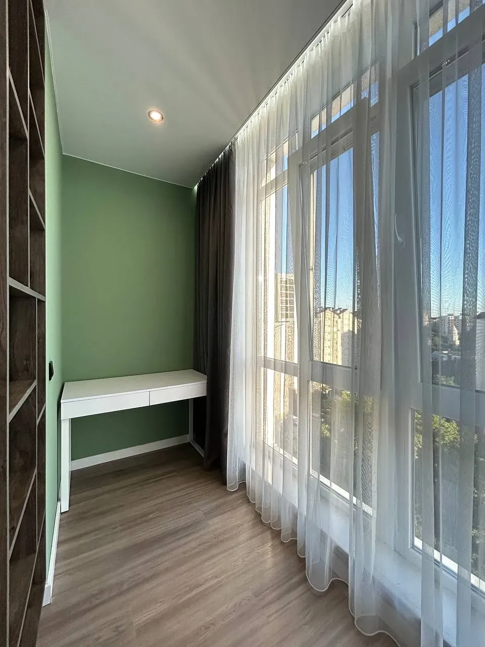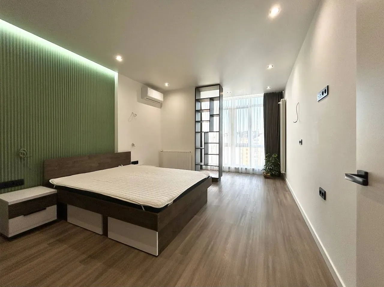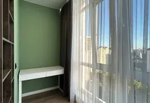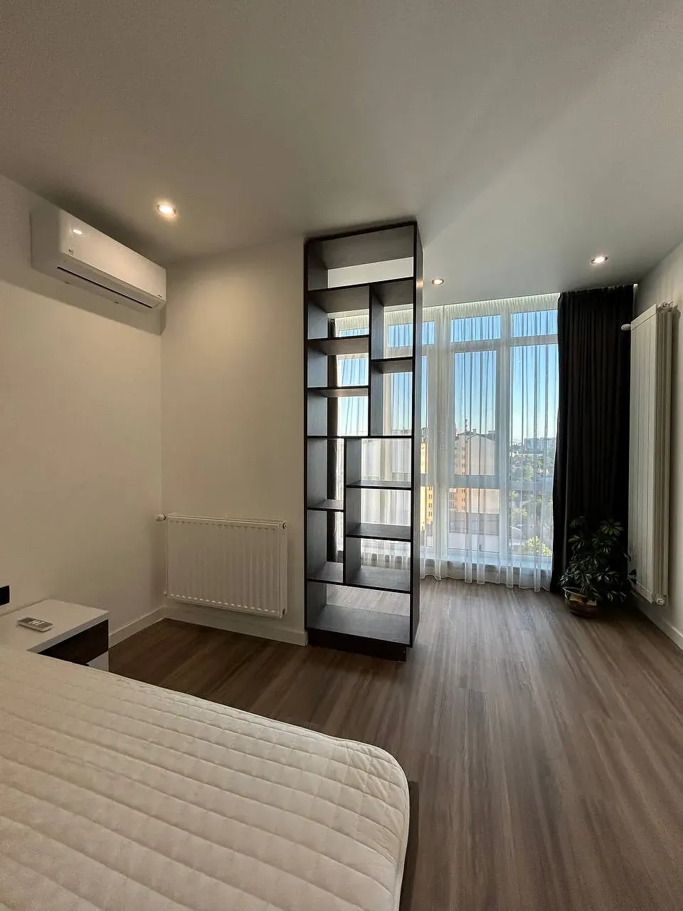 • у спальні є все необхідне для проживання: двоспальне ліжко, кондиціонер, велика шафа для речей, робоча зона та велике панорамне вікно з видом на захід сонця та місто