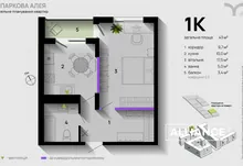 Планування квартири є зручним, простора ванна кімнатна розміром 5 м.кв, а також зона передбачена під гардероб не змусить вас відчувати нестачу простору в однокімнатній квартирі.