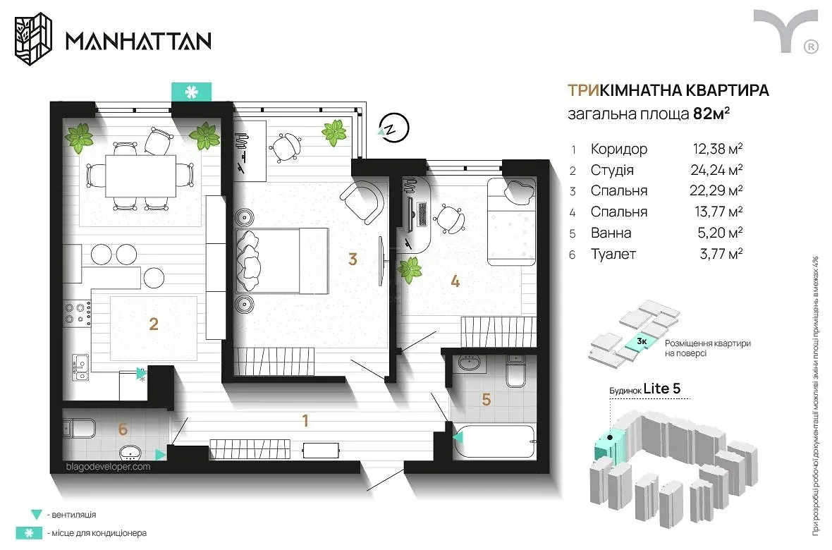 Кухня студія + 2 кімнати