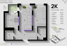 Простора та світла квартира площею 56 м² розташована на 13 поверсі сучасного будинку у затишному спальному районі Івано-Франківська.