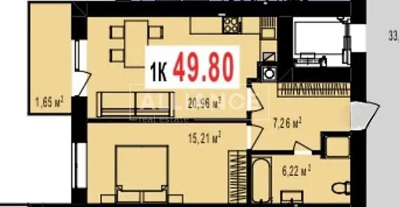 Зручне сучасне планування: простора кухня-вітальня 21 м.кв. з виходом на балкон, і окрема затишна спальня.