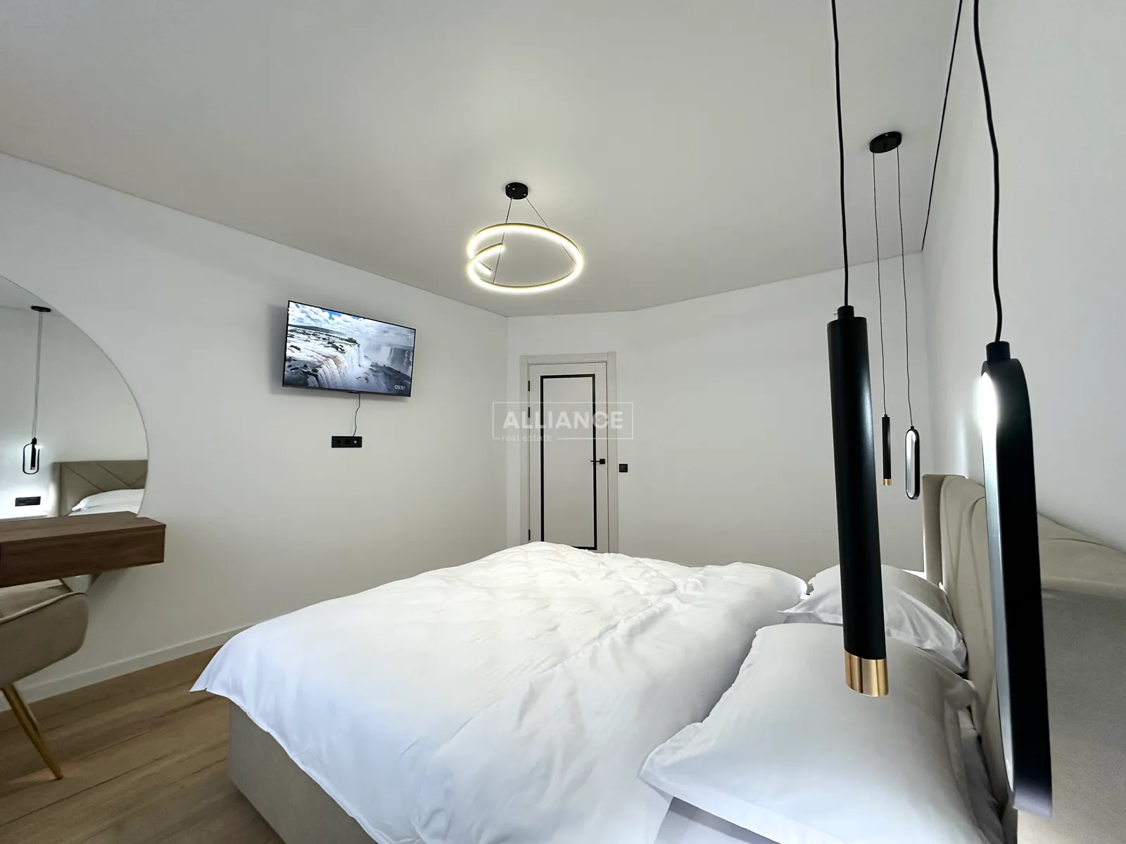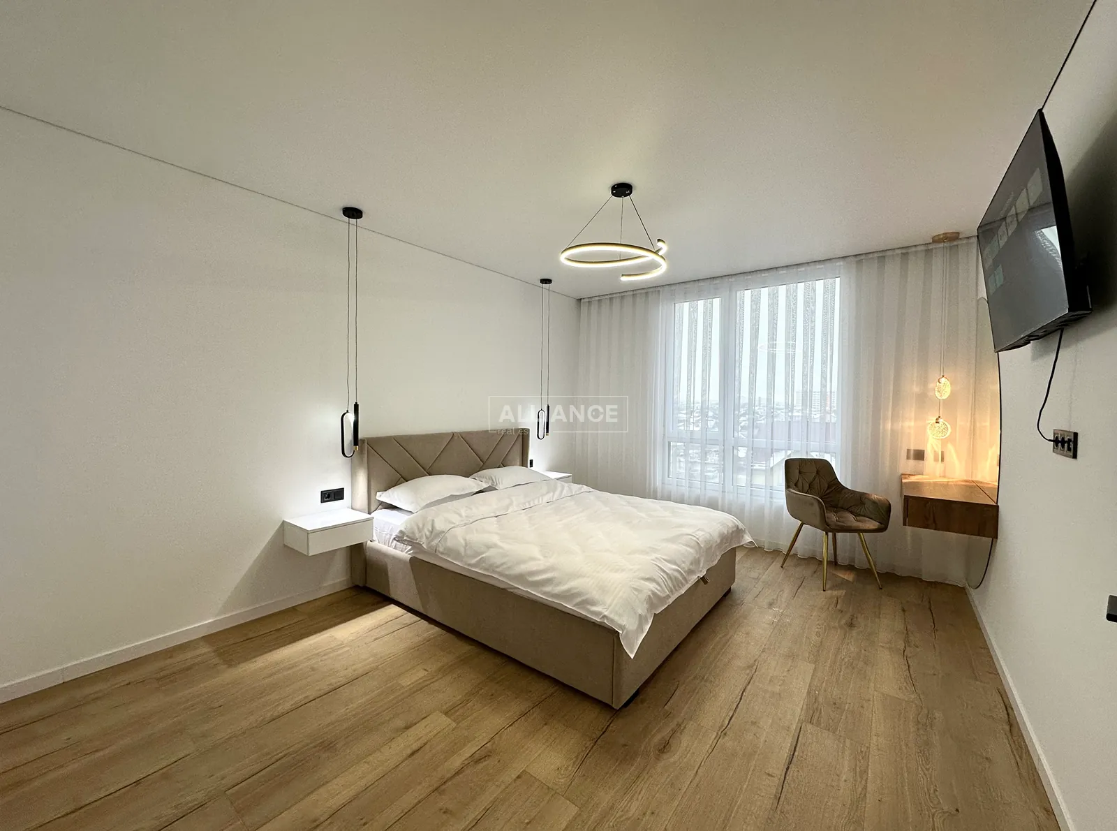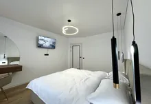 Окрема спальня кімната, гардеробна кімната, стильний санвузол та простора кухня.