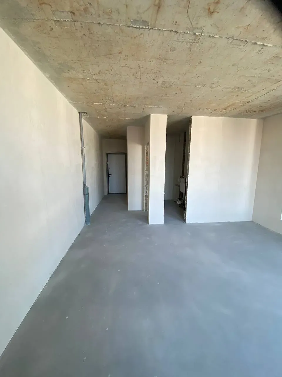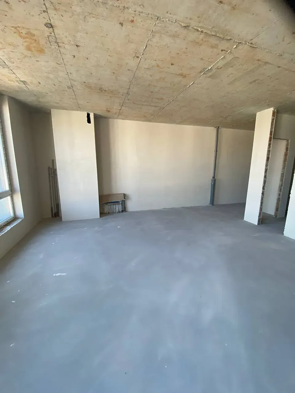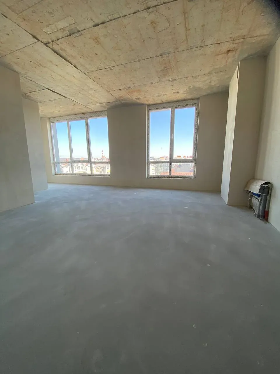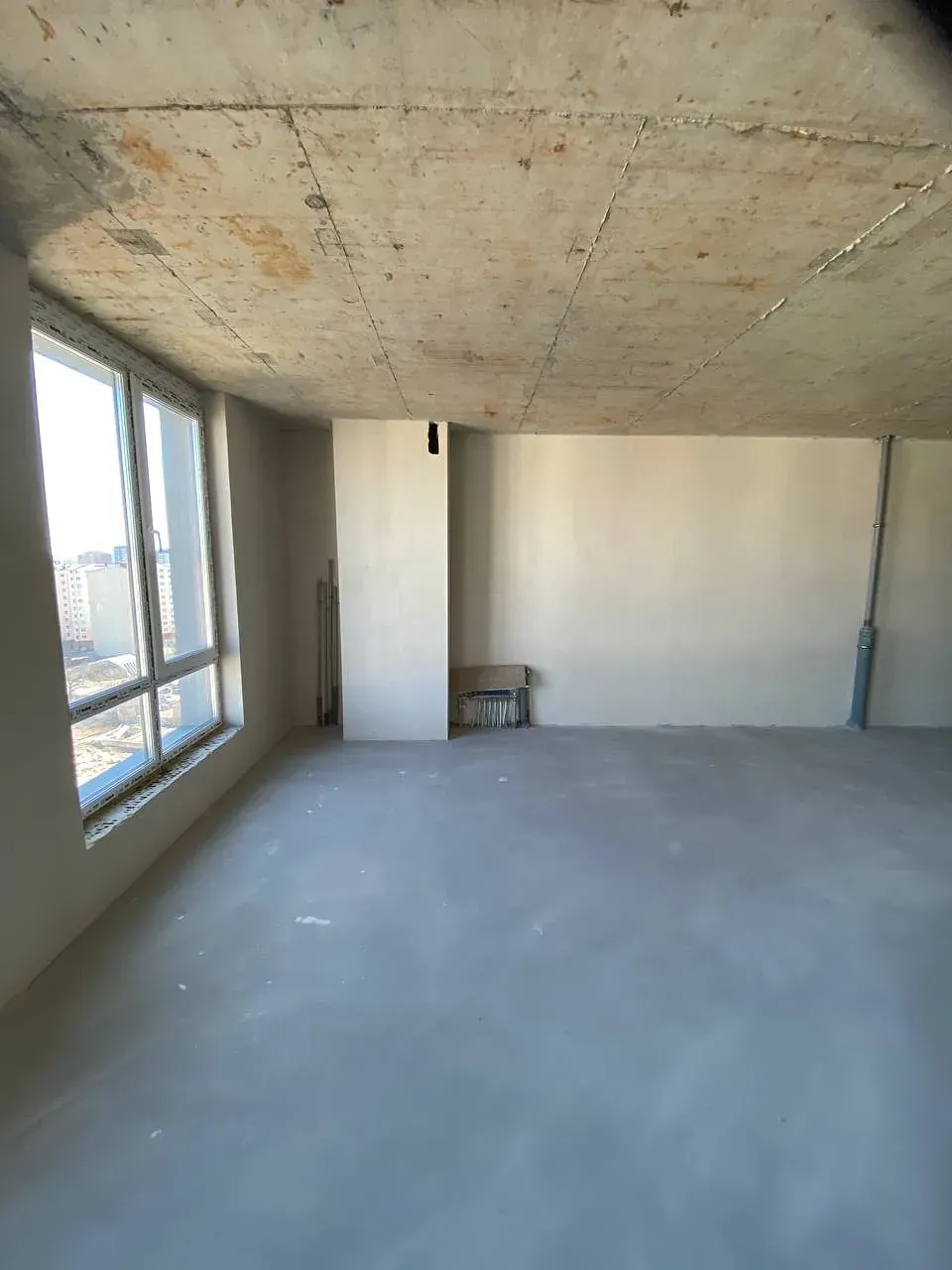 Велика кухня-студія з панорамними вікнами та окрема спальна кімната.