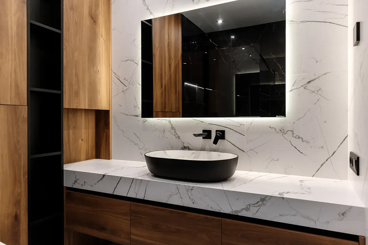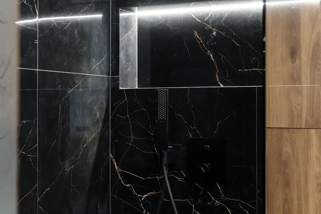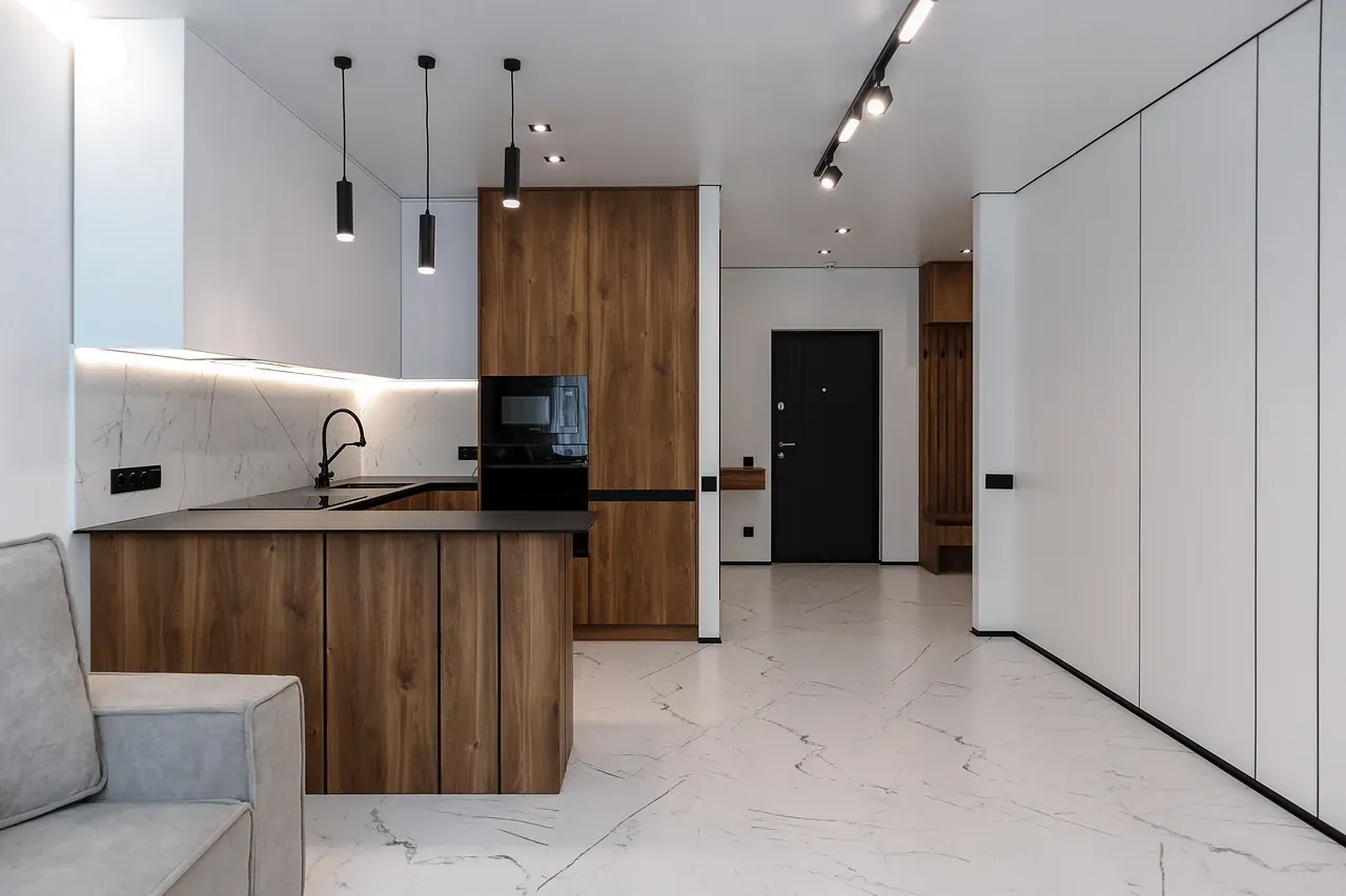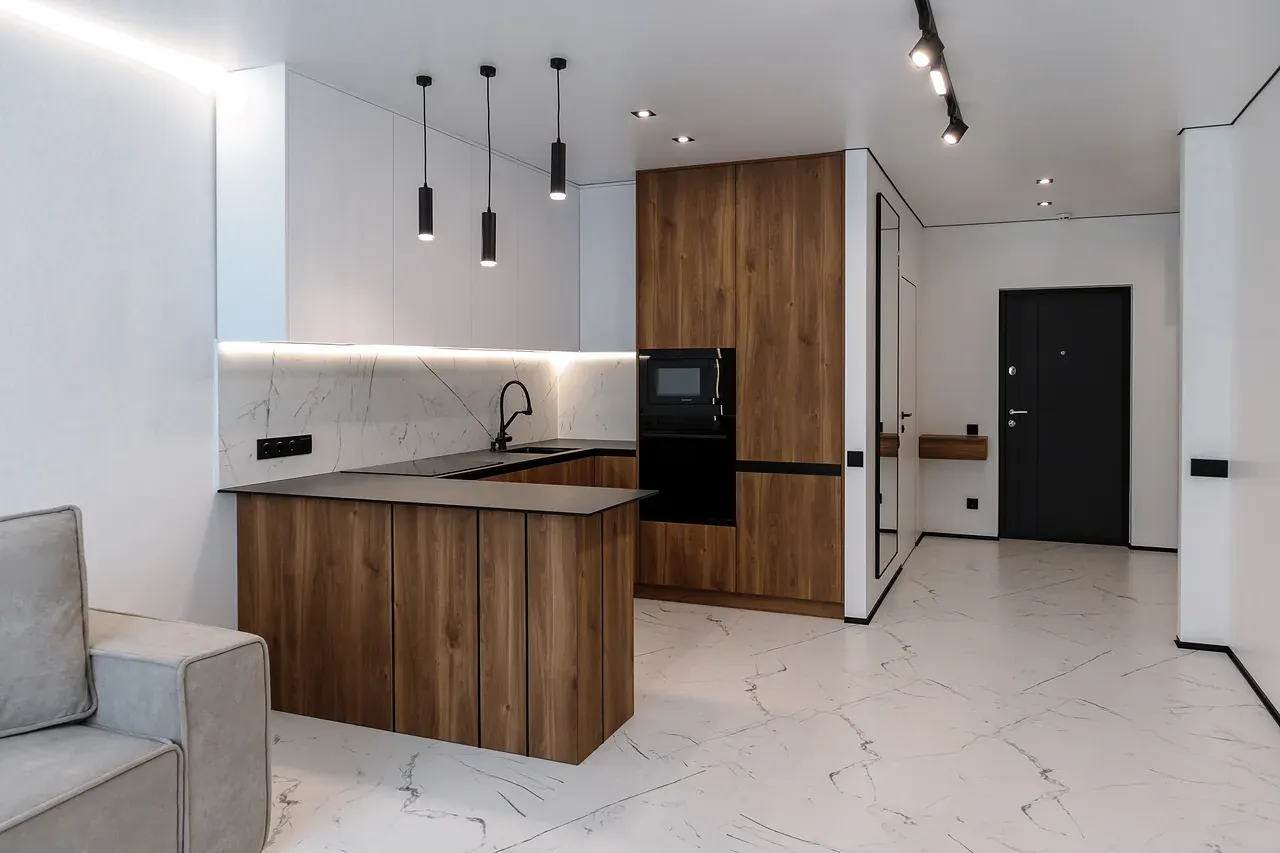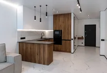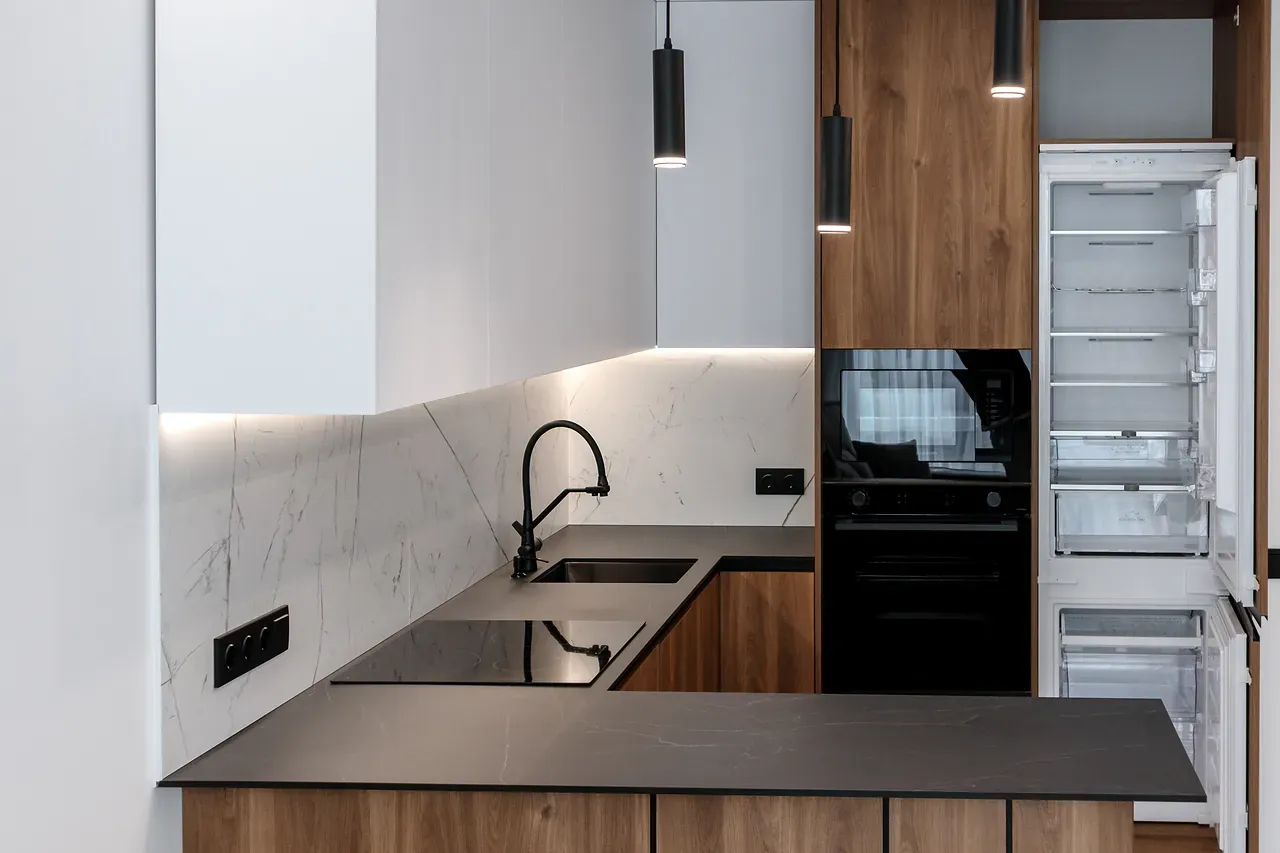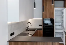 - на кухні встановлено: посудомийку, духова шафа, мікрохвильовка, індукційна плита, холодильник та морозильна камера, встановлено підсвітку робочої поверхні