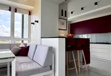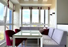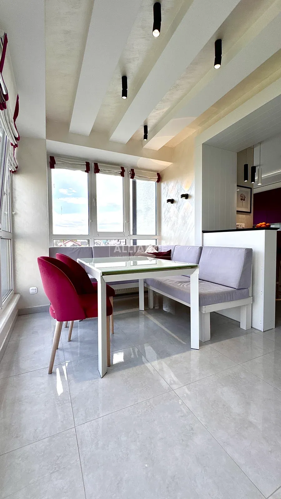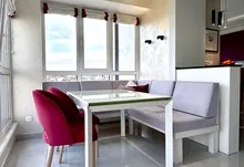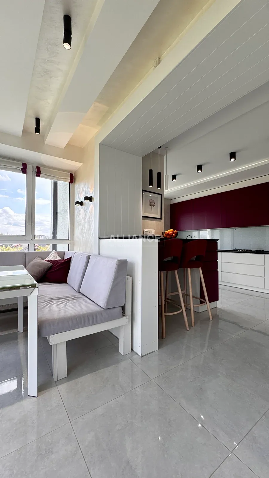 • велика кухня-студія з відпочинковою зоною та панорамними вікнами з виглядом на зелену зону