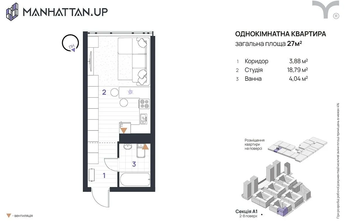 Квартира загальною площею 27 м2 з функціональним продуманим плануванням: