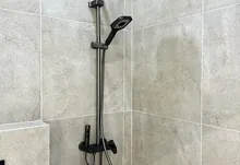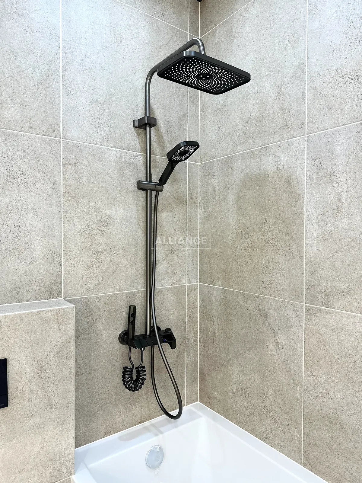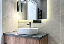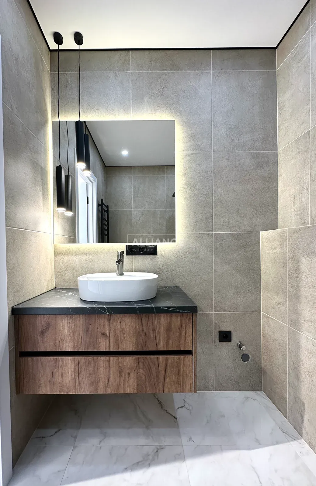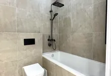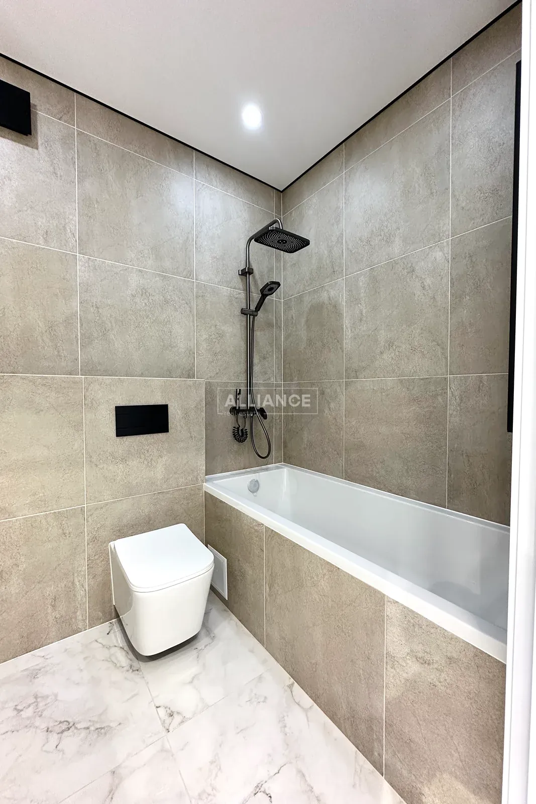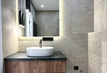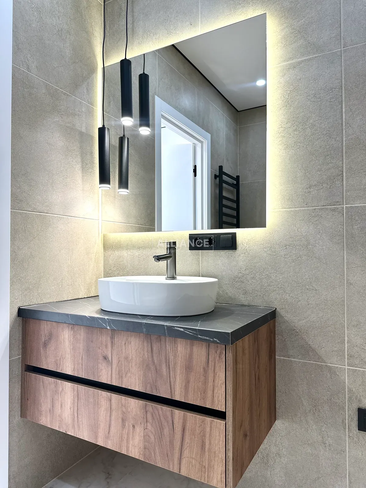 У санвузлі туалет інсталяція, ванна, тропічний душ, дзеркало з підсвіткою, великоформатна плитка