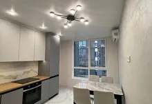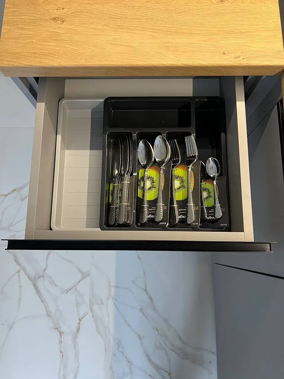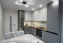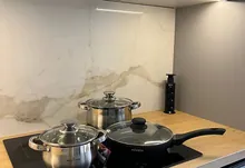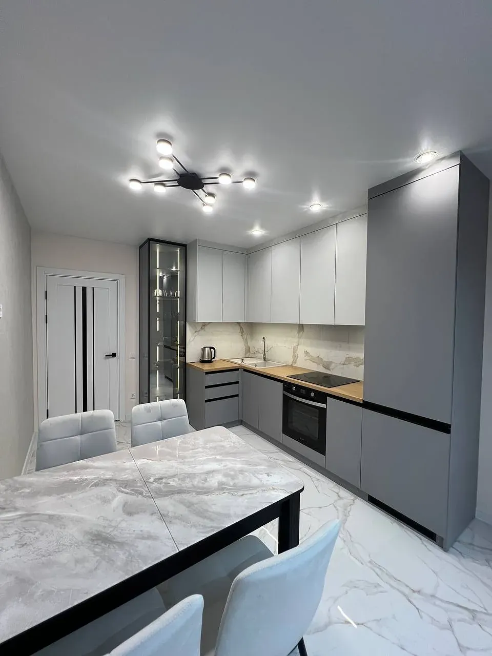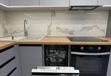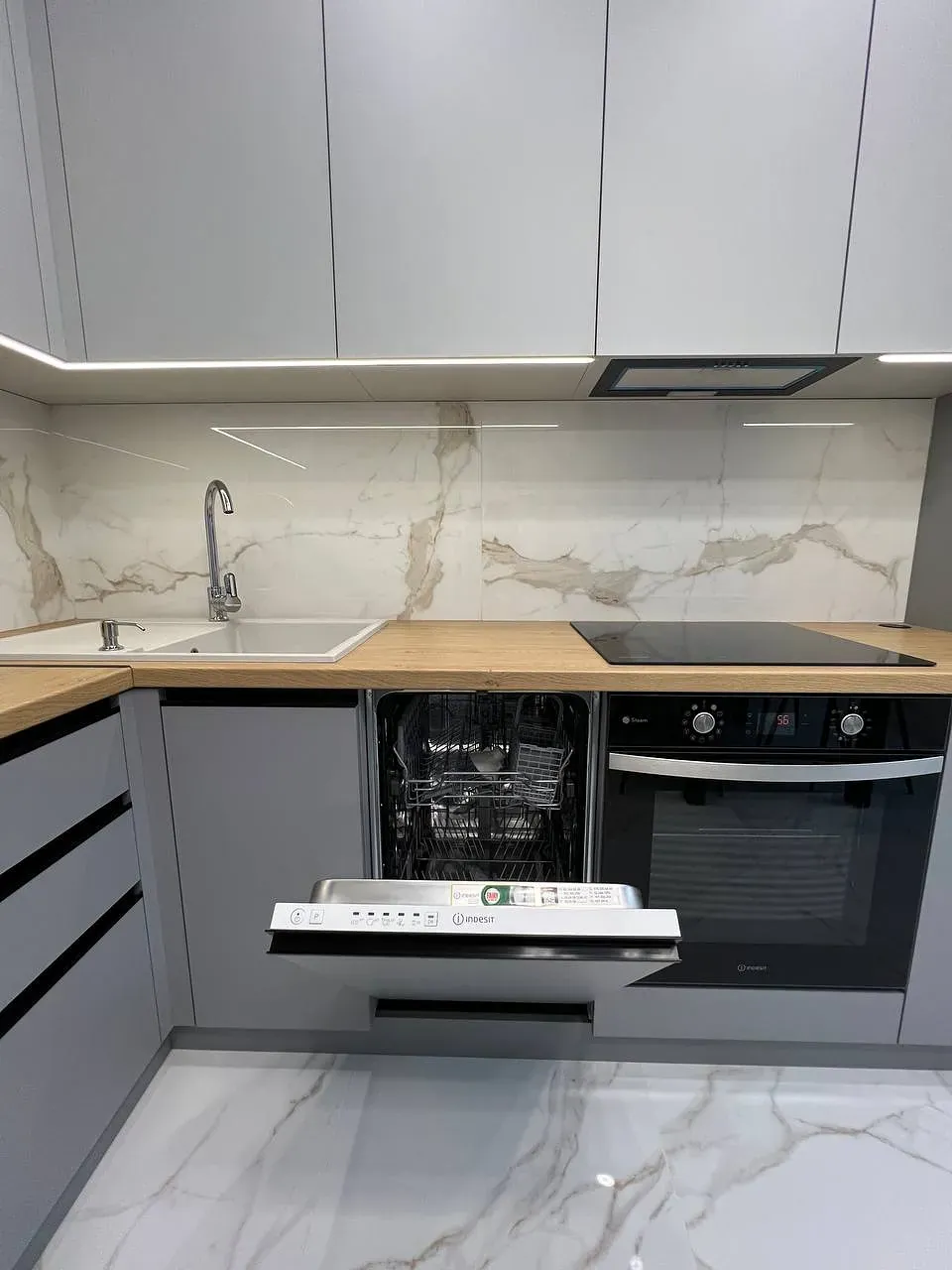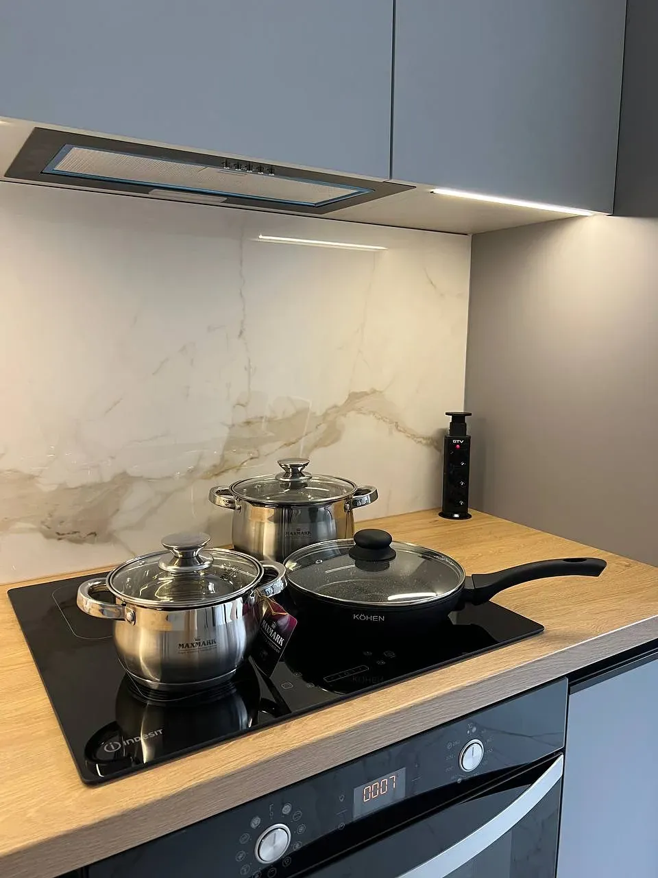 На кухні холодильник з морозильною камерою, духова шафа, індукційна плита, витяжка, посудомийна машина (був перший запуск, готова до використання), чайник,базовий набір посуду ( 2 банячки, сковорідка, столові прибори, тарілки, горнятка та склянки)