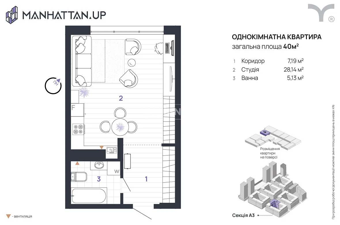 • Простору студію – 28,14 м²