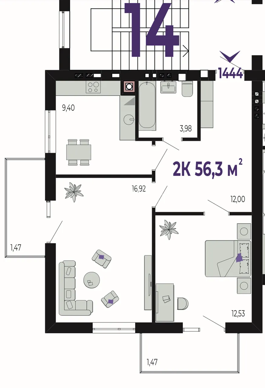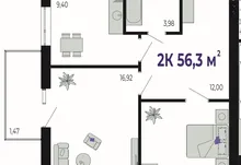 Квартира загальною площею 56,6 м2 розташована на зручному 4 поверсі, з продуманим плануванням: