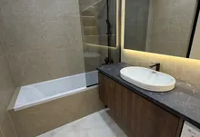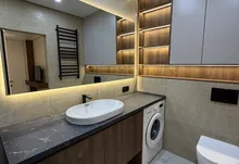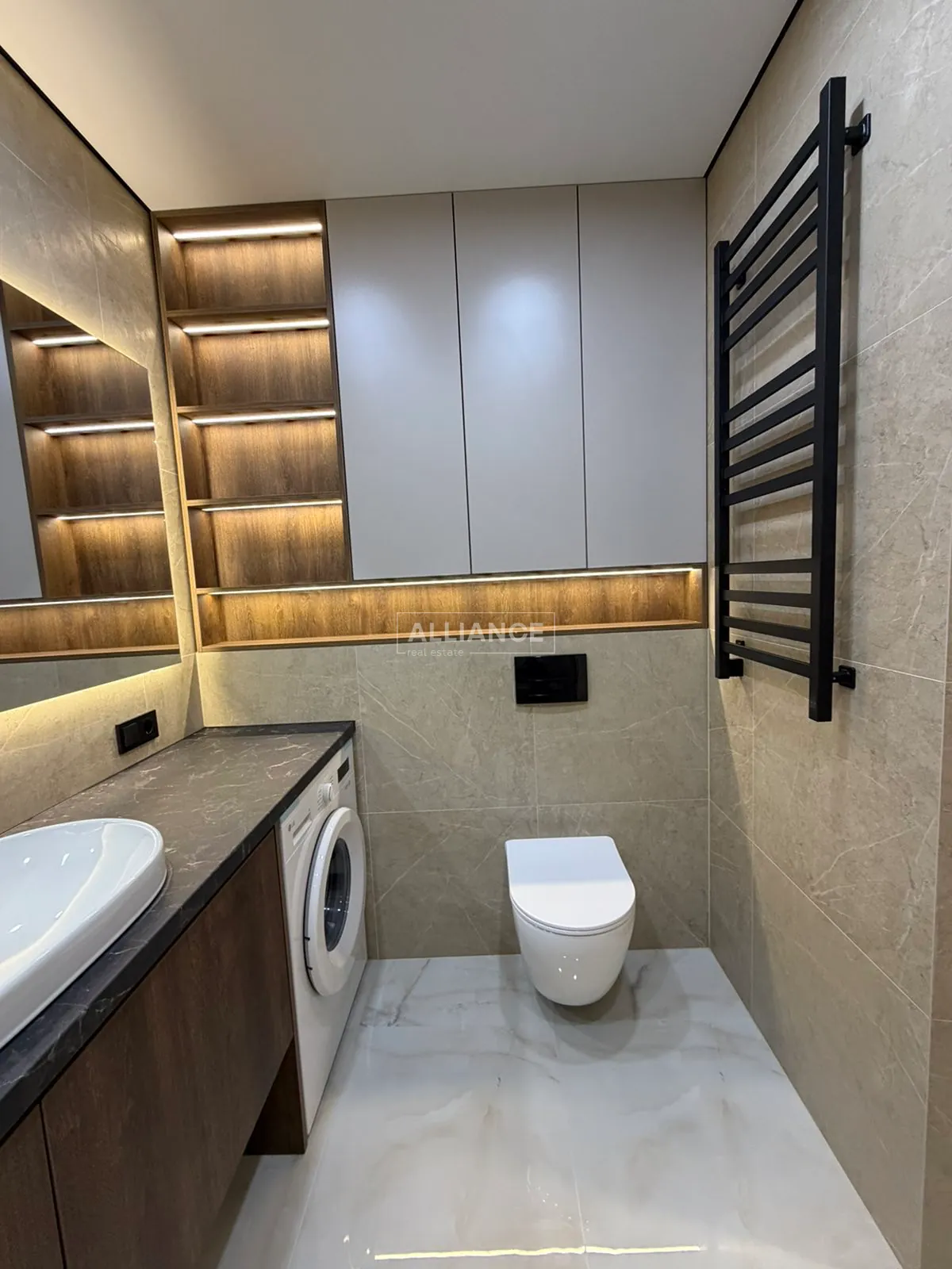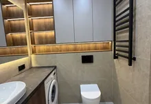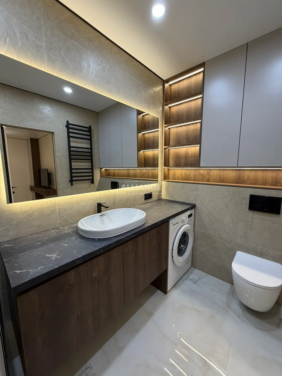 У санвузлі туалет інсталяція, ванна , пральна машинка, дзеркало з підсвіткою.