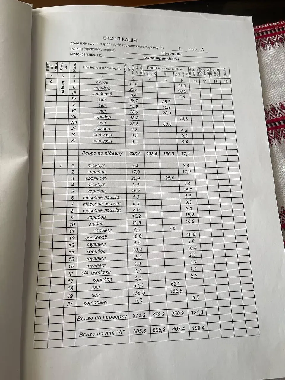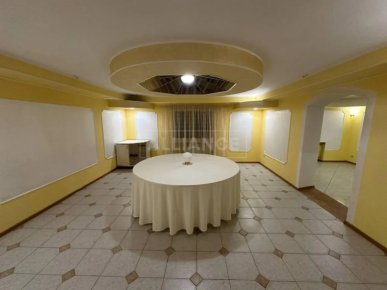 Загальна площа 700м2 – перший поверх кухня, великий зал , зал поменше , санвузли і безліч кабінетів і т д .