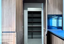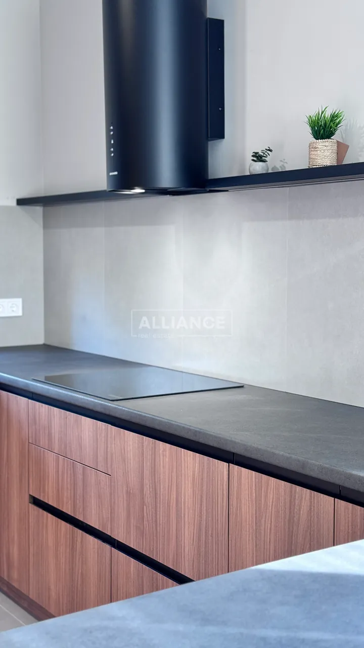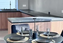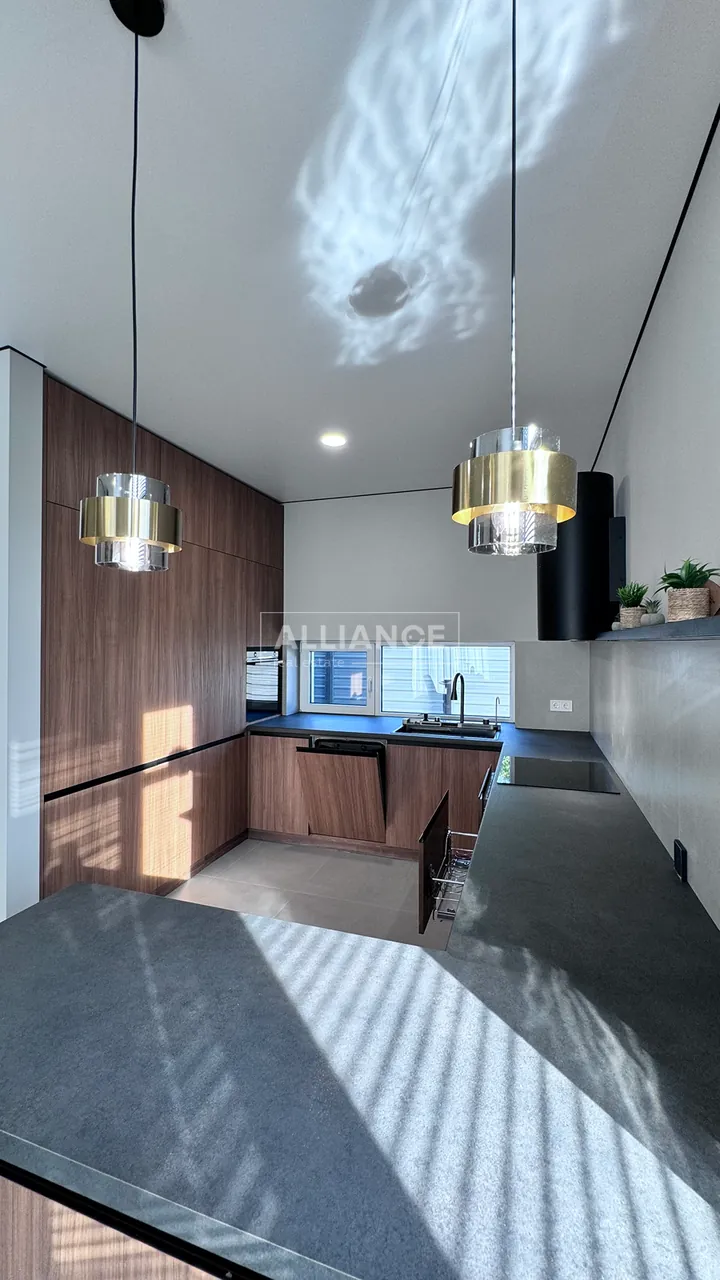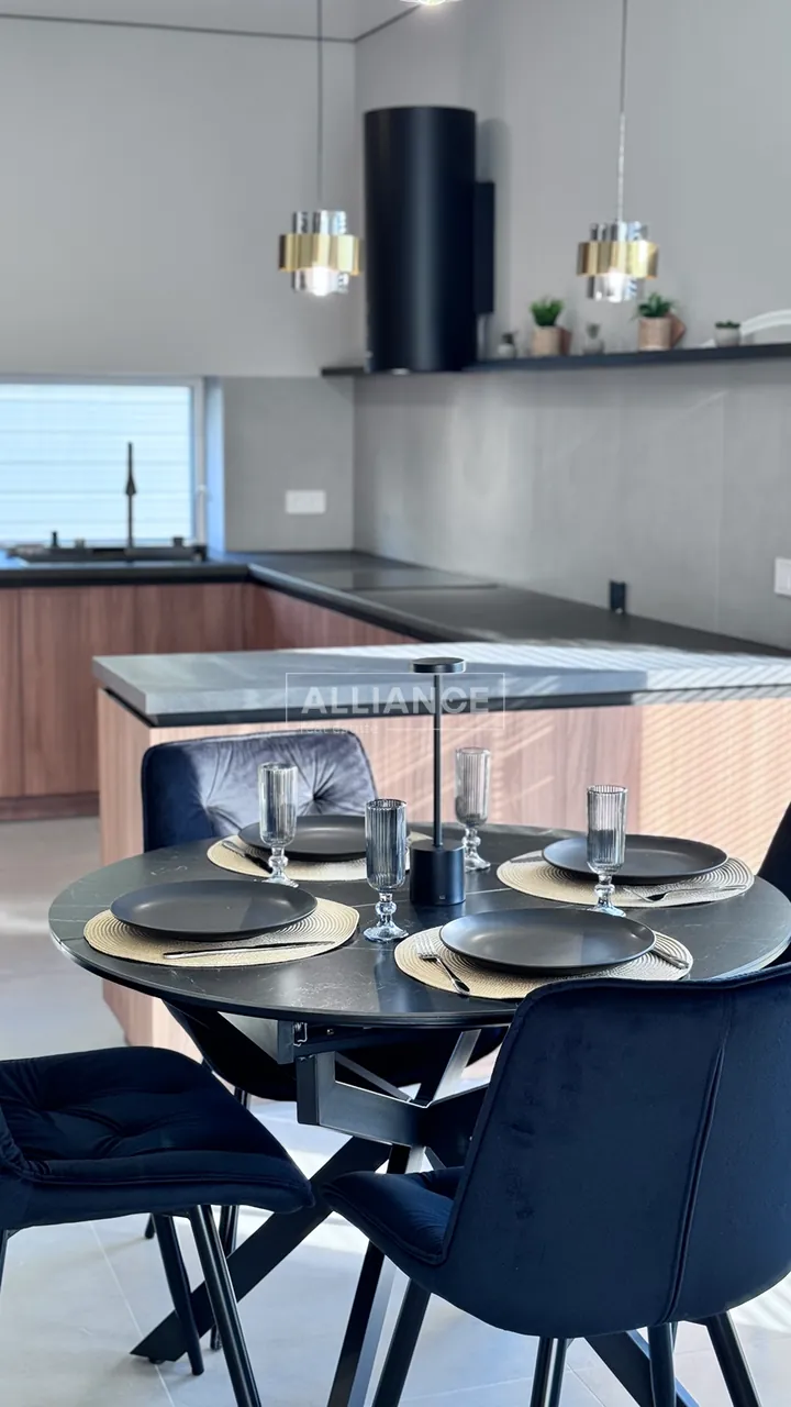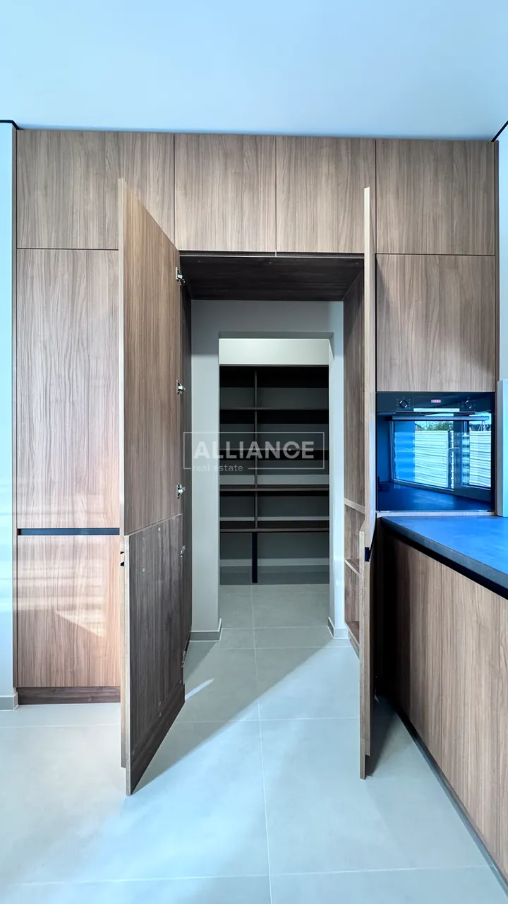 * На першому поверсі, є велика кухня-вітальня. – Кухонна робоча зона повністю облаштована. Вмонтована якісна кухня, побутова техніка (холодильник, варильна поверхня, духова шафа, мікрохвильова піч, витяжна система, посудомийна машина) В кухні є дуже цікава і воодночас дуже потрібна річ як прихована КОМОРА ,яку дуже оцінить господиня, так як там можна буде зберігати від домашньої консервації то свіжих овочей та фруктів. Ну і обідня зона, стіл (який за бажанням може стати більшим) та крісла.