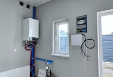 Опалення 24 кВт Конднсаційний котел виробника Ariston( максимТепла підлога по усьому першому поверсі на другому поверсі в санвузлах. Також на перщому поверсі встановлено інверторний кондиціонер Cooper and Hunter