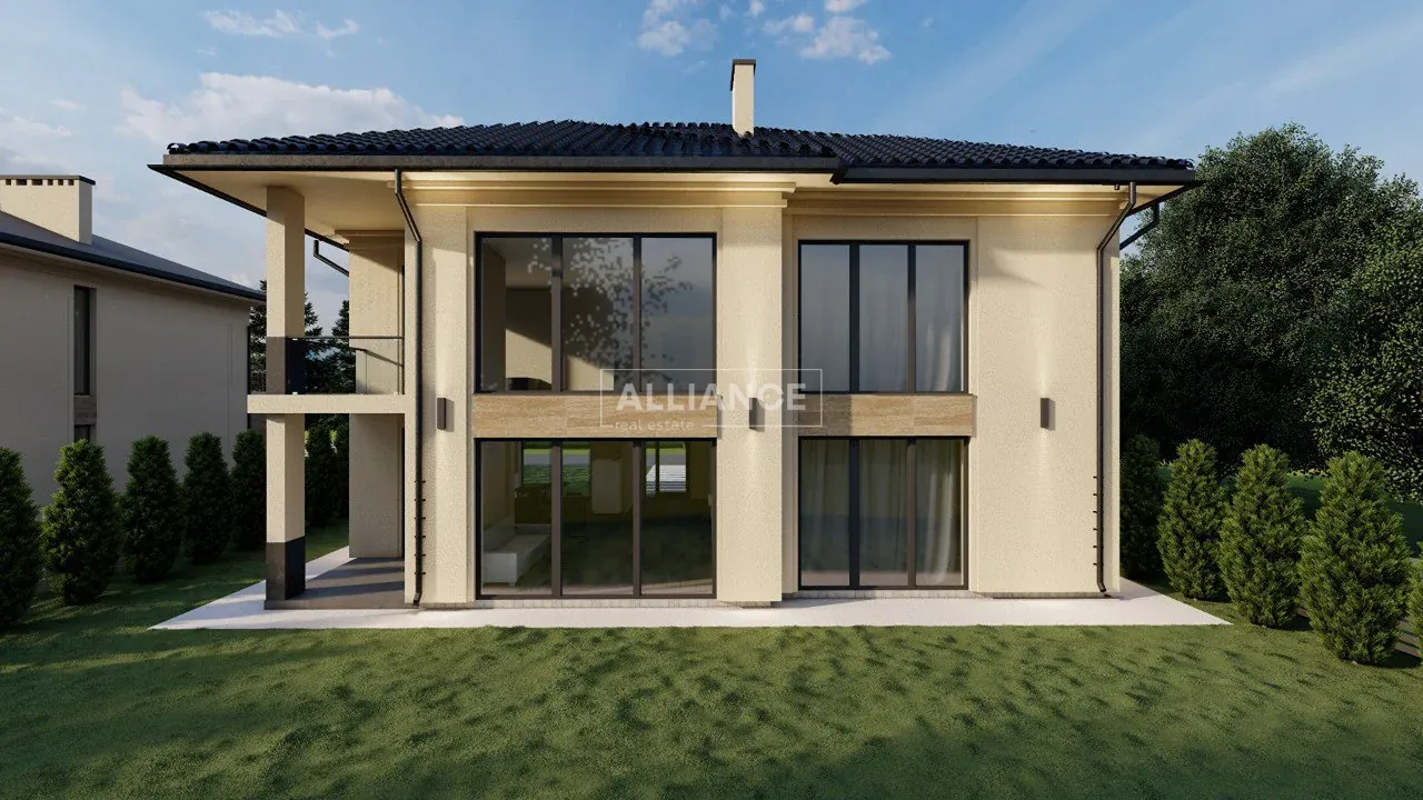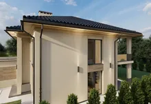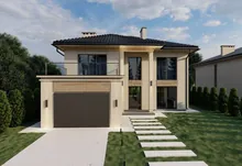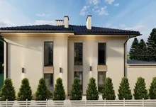 Фасад виконаний у сучасному стилі: великі панорамні вікна, балкон, простора тераса. Правильна форма будинку дозволяє раціонально використати ділянку.
