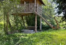 Біля альтанки та будиночку на дереві протікає невеличка річка.