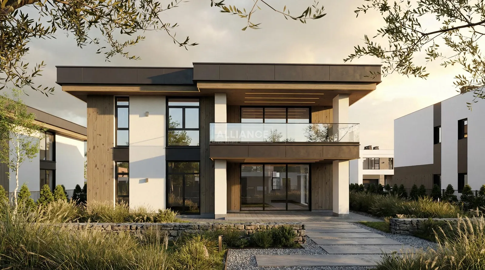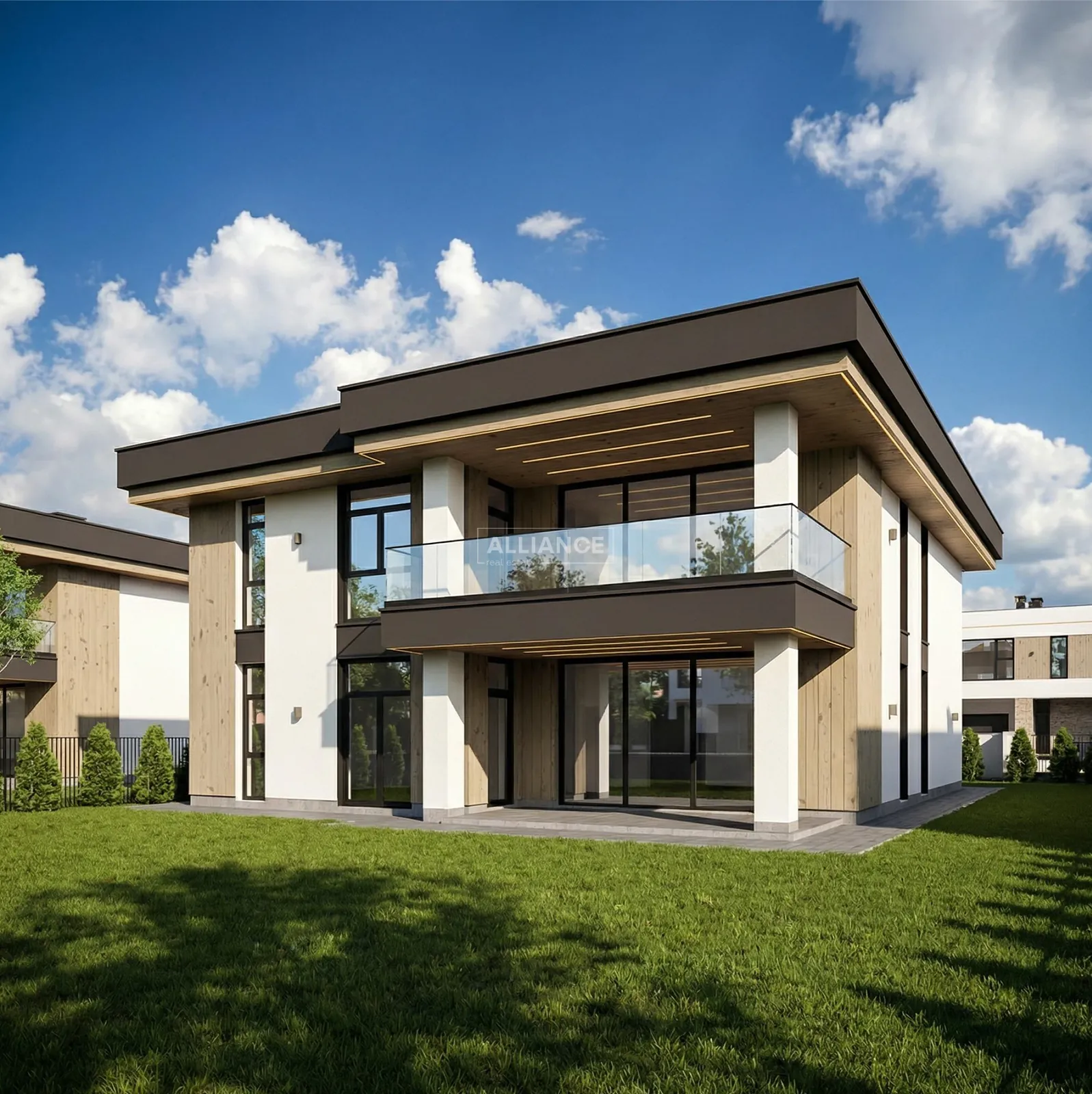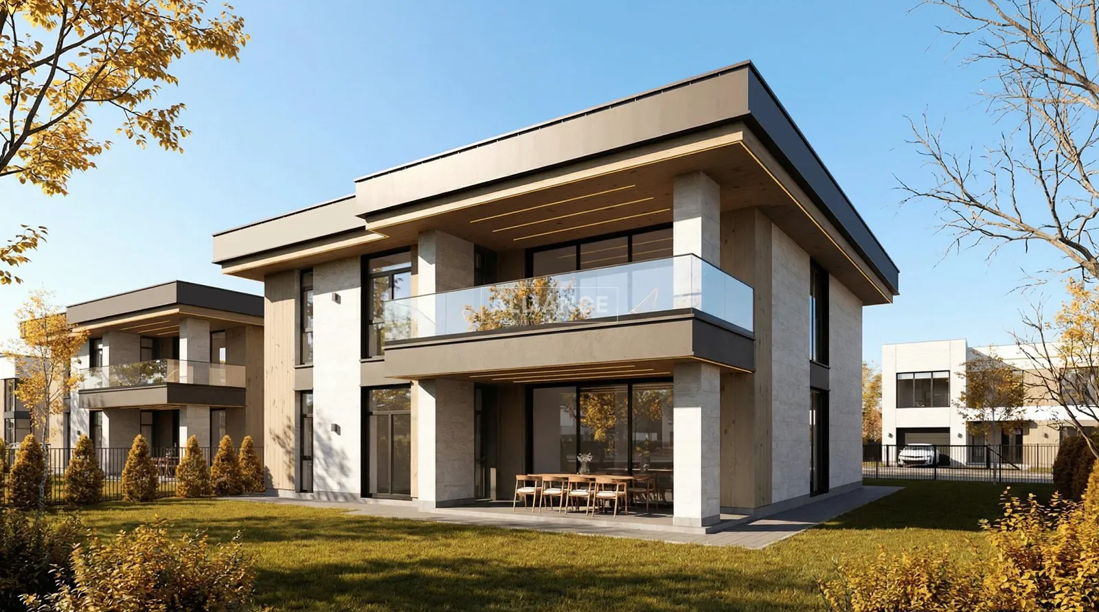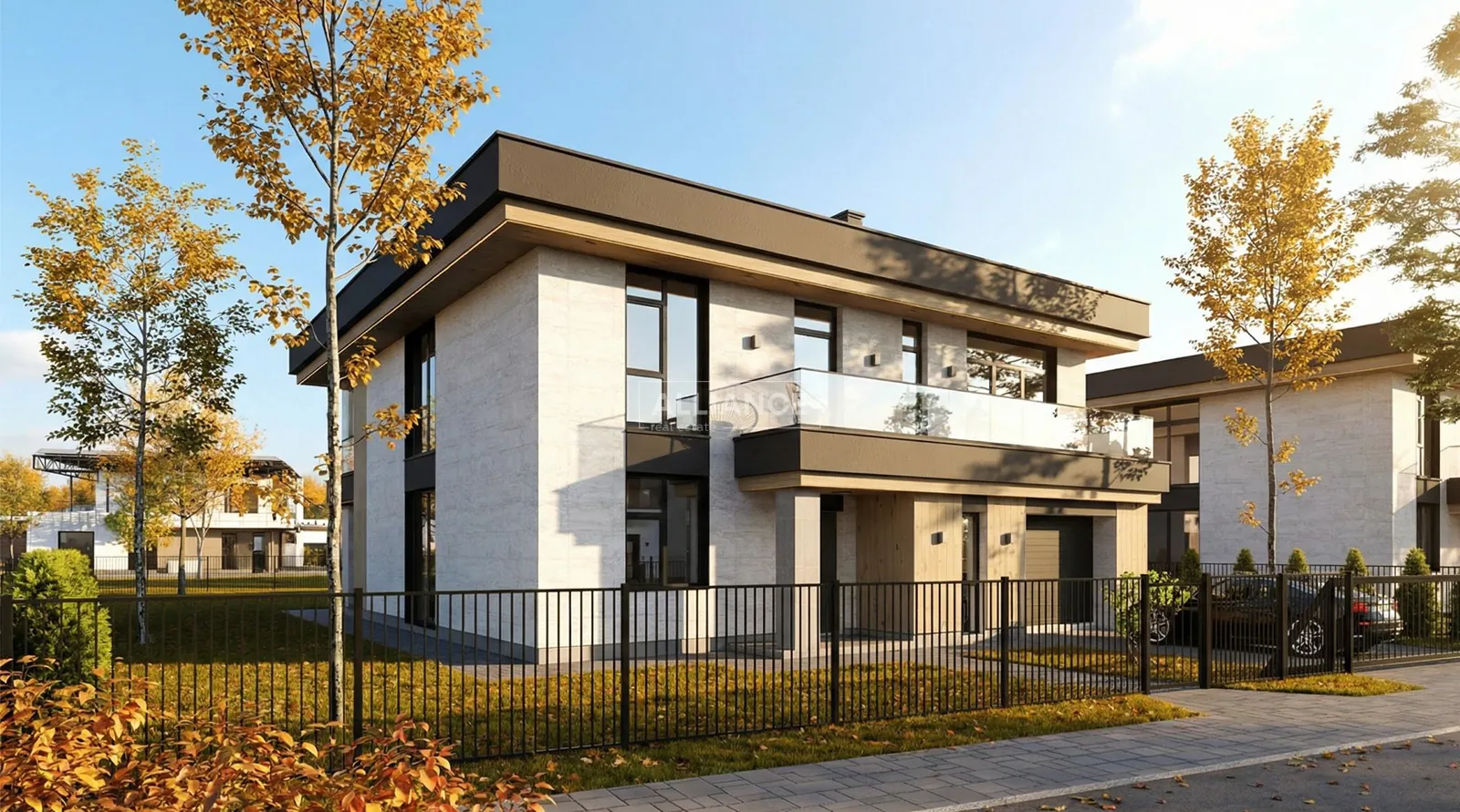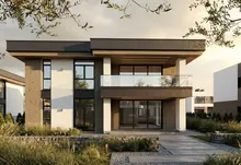 Будинок має сучасну архітектуру з плоским дахом, панорамні вікна, великі тераси та вбудований гараж. Територія комплексу закрита, забудова однорідна, сусідство відповідного рівня.