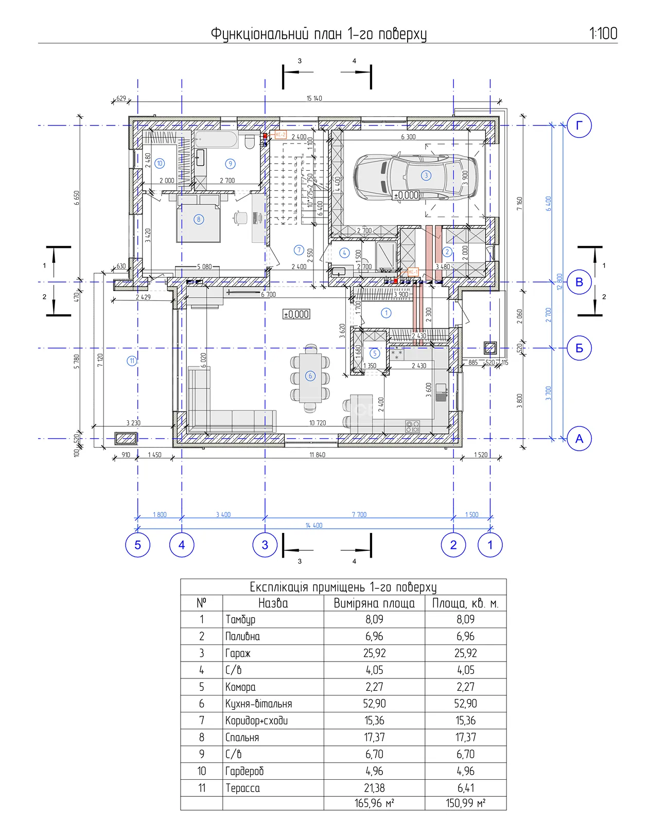 На першому поверсі розташована простора кухня-вітальня 52,9 м² з виходом на терасу, гараж 25,9 м² з входом у будинок, окрема спальня, два санвузли, гардероб, паливна та комора. Перший рівень повністю функціональний — можна комфортно жити навіть без використання другого поверху.
