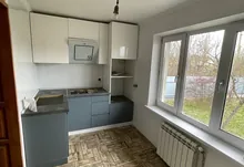 Кухонні меблі входять у вартість — сучасні, виготовлені на замовлення. Фасади пофарбовані автомобільною фарбою, що забезпечує глибокий колір, стійкість до подряпин і вологи.