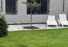 Зелений двір з рулонним газоном, фруктовими та декоративними деревами, кущами та автоматичною системою поливу Hunter.